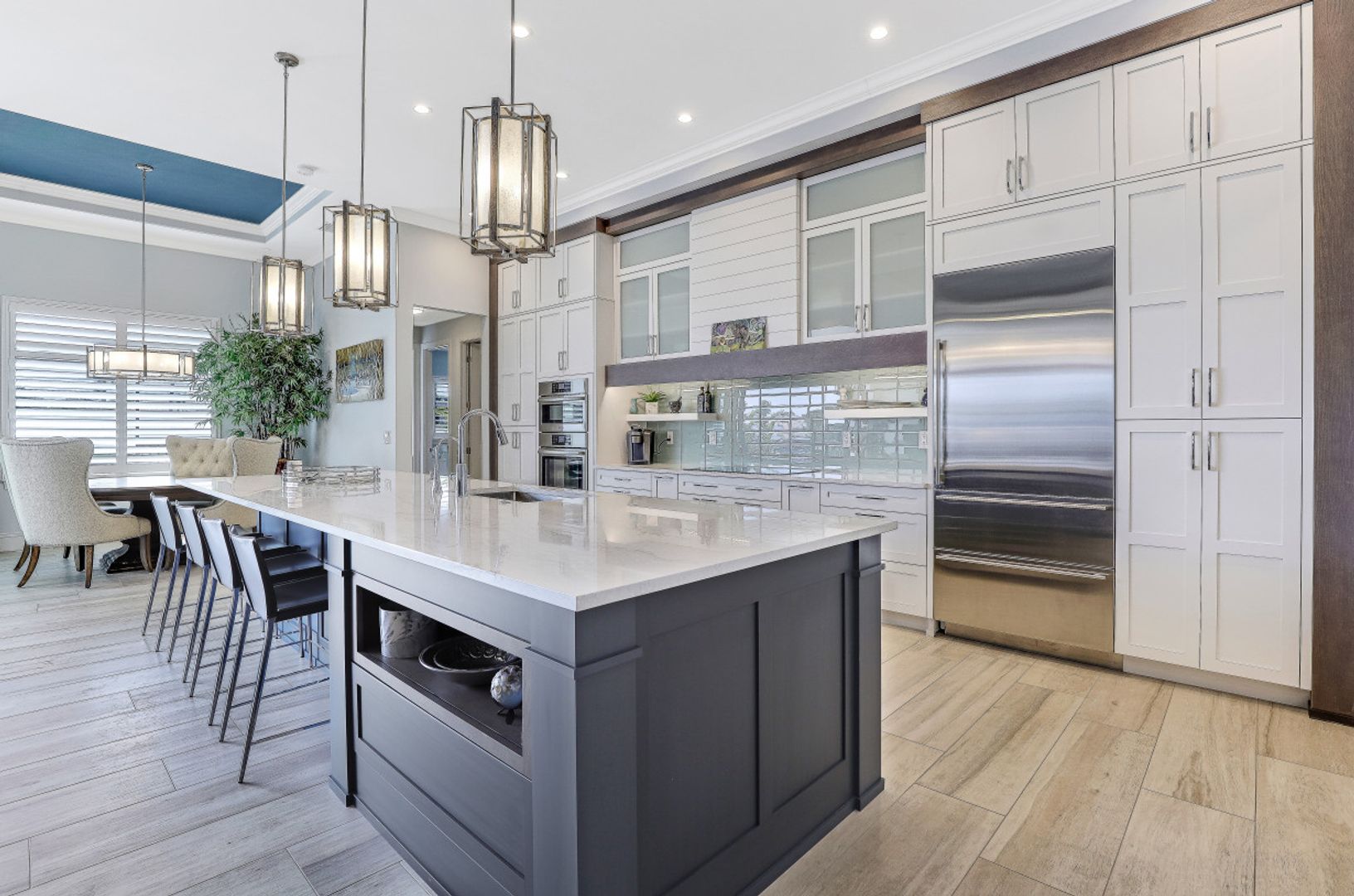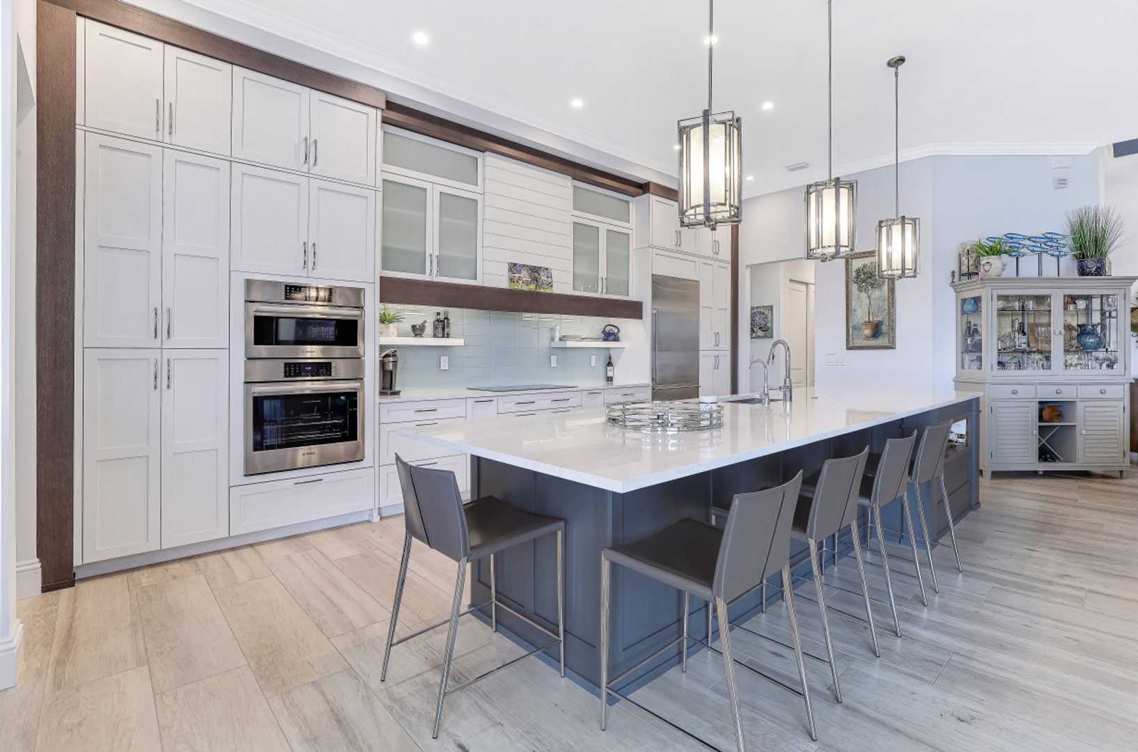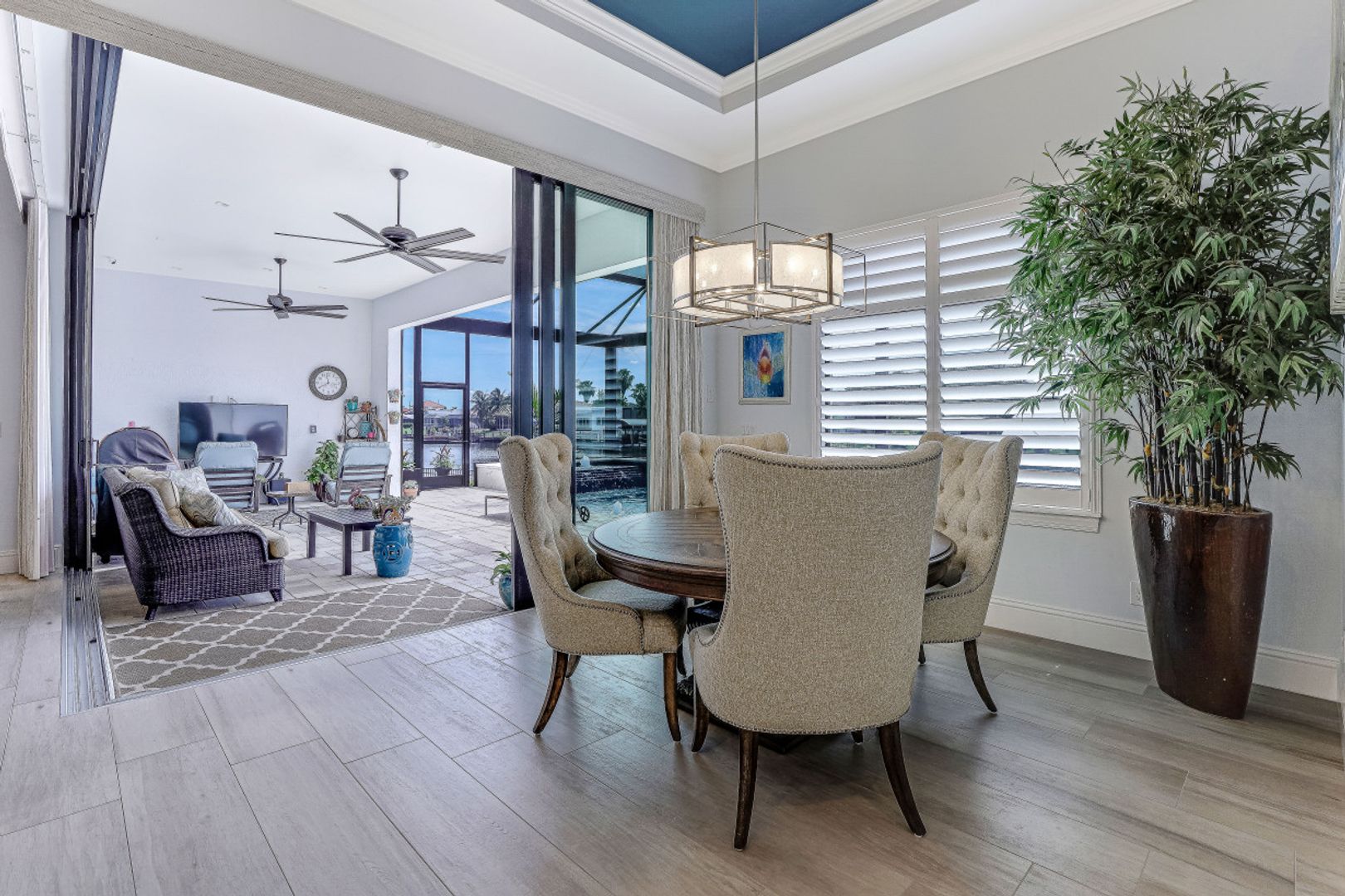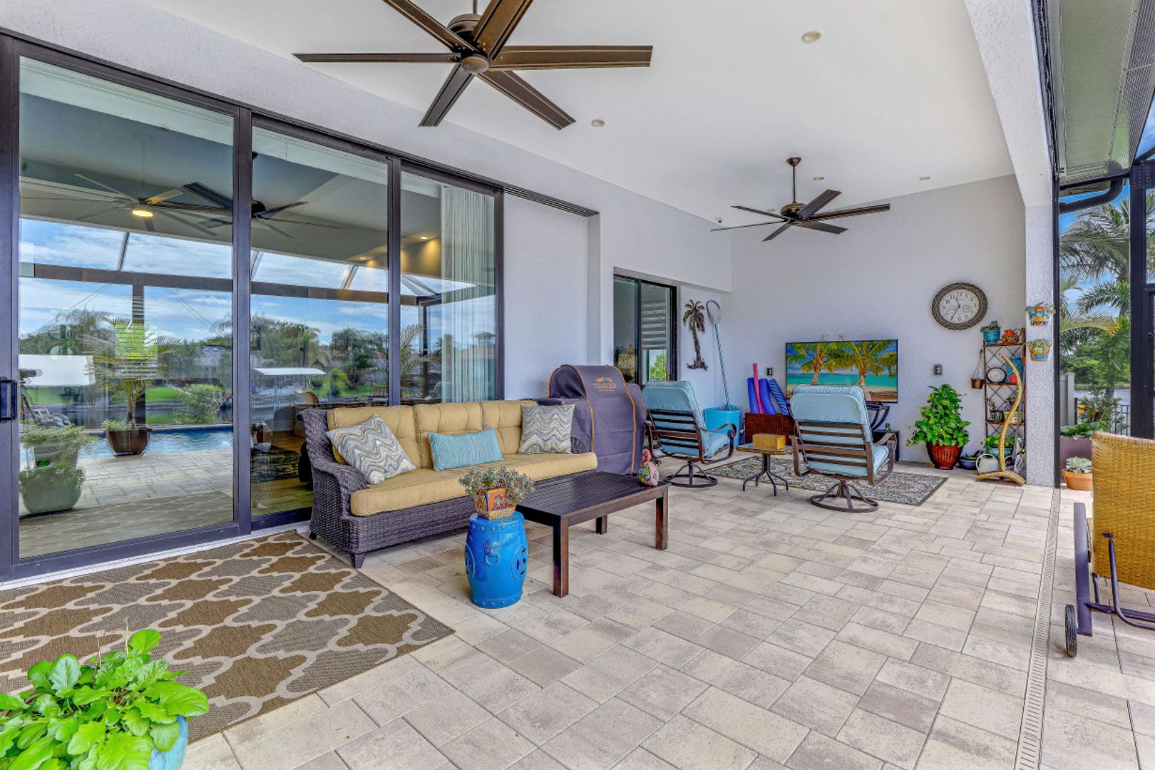 WIDE INTERSECTING CANAL VIEWS, WALKING DISTANCE TO CAPE HARBOUR SHOPS, RESTAURANTS & ENTERTAINMENT! 2-Year Old Modern Contemporary Home 5BR, 4BA, 3 Car Garage w/Workshop. 12ft ceilings, floating cabinets, IMPACT WINDOWS/DOORS, 12x28 porcelain tile, upgraded ceiling fans/LED lighting & coffered ceilings. Gourmet kitchen showcases high end appliances like Sub Zero refrigeration & GE Monogram wine/bev fridge, huge 13x4 quartz countertop island & so many gorgeous cabinets! Video surveillance system, whole house surge protection & generator transfer switch. Outdoor living exceeds expectations in this safe & convenient walking, biking & boating community. Beautiful landscaping, FENCED yard, heated saltwater pool include 4 tranquil fountains, cascading waterfall, spa & sun shelves all surrounded by picture window bug-free screening. Boaters will be pleased by the Captains Walk, HUGE wrap around composite dock, 10K boat lift & kayak launch. Perfect for the entertainer or for quiet personal enjoyment nestled in SW Cape Coral boating community. You deserve to enjoy everything that SW FL has to offer: boat, kayak, jet ski, fish; or take a dip in your private oasis! Furnishings negotiable!