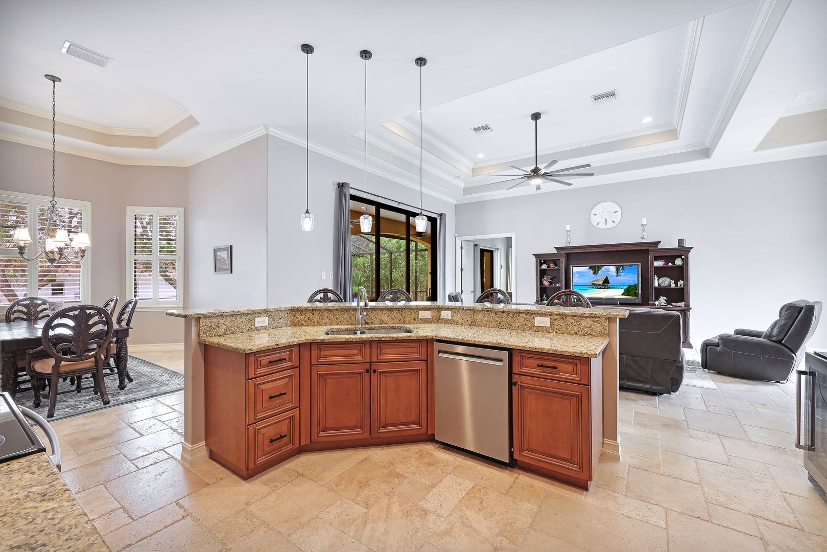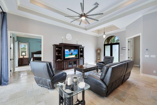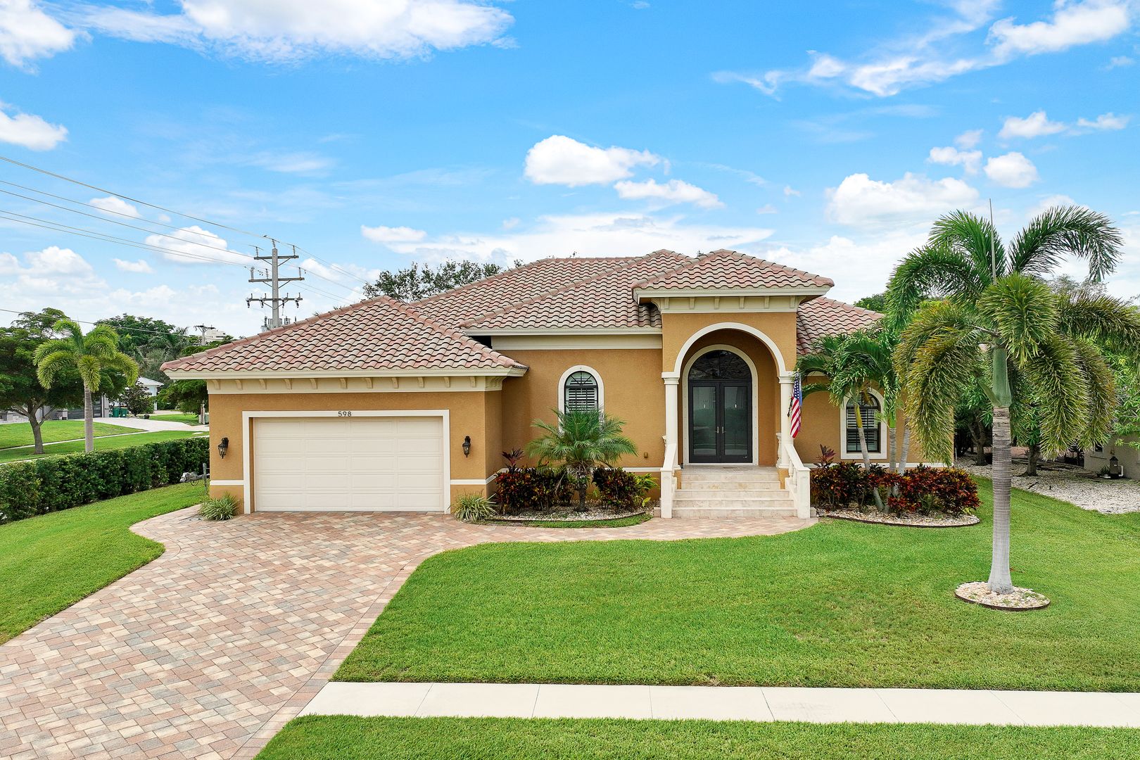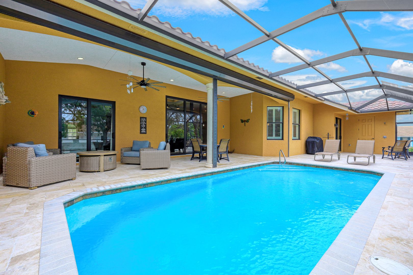 NO CAR NEEDED!!!!! LIVE LUXURIOUSLY WITH LOCATION, LOCATION AND LOCATION. HIGHLY SOUGHT AFTER SOUTHSIDE MARCO - THE NEW DOWNTOWN. CONVENIENCES AT YOUR DOORSTEP!!! BEACH, THEATRE, MINIATURE GOLF, SHOPPING, RESTAURANTS, ART LEAGUE, BINGO AND THE LIST GOES ON. Oversized western exposure lot. Full lanai with pool bath and outdoor shower. Pool Heater 2022. Quality and perfection reside here. You are greeted at the front entry with Travertine Tile, Concrete railings, balusters, and Decorative impact glass double door. Impact glass and Travertine throughout. Enjoy all the 12’ ceilings in the living area trayed to 13’ some to 14’ enhanced with Crown Molding along with 10’impact sliders. Plantation Shutters. Large dream kitchen with upgraded cabinets and huge breakfast bar island seating for 6, Double cabinet Pantries, and new dishwasher 2023, Microwave 2021. Beautiful large den with Glass French Doors. Guest bedrooms enjoy their own foyer entrance. The guest bath is large with 2 sinks. Generous size laundry room - washer and dryer 2019. Closets have custom shelving, Fanimation fans, garage has 3 4’x8’ overhead loft storage and Epoxy flooring. Huge plus in addition to the impact glass, the Lanai has a roll down shutter and all other windows have Lexan hurricane panels. Welcome Home!!!