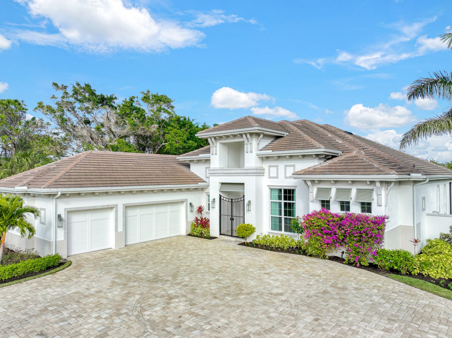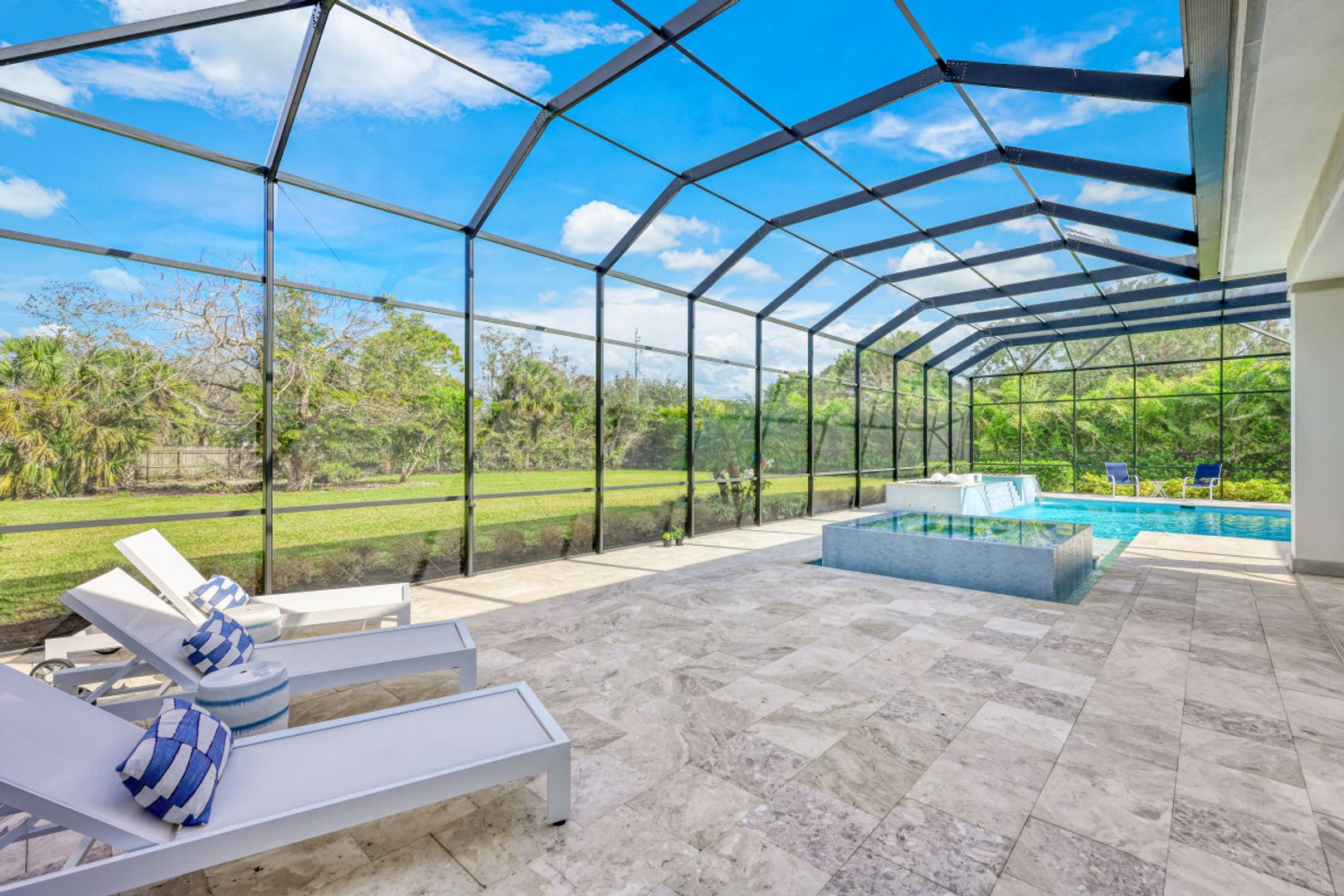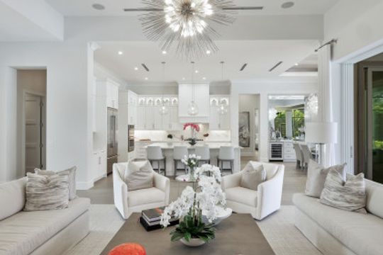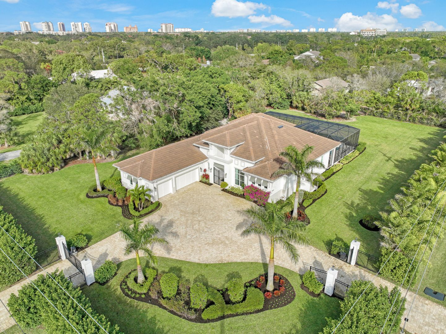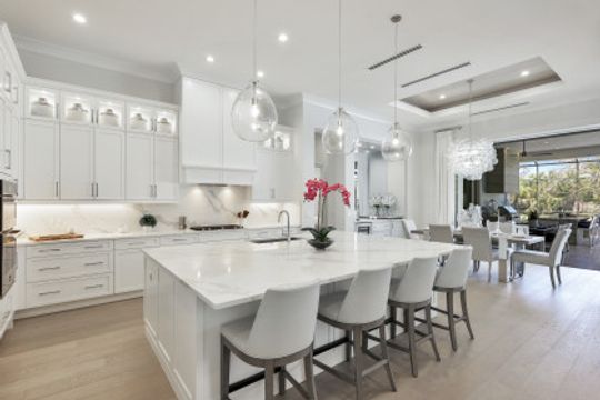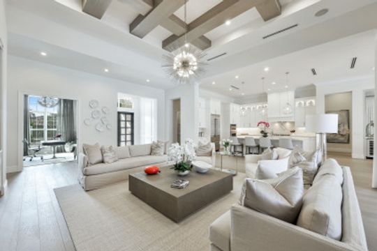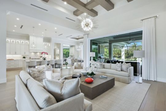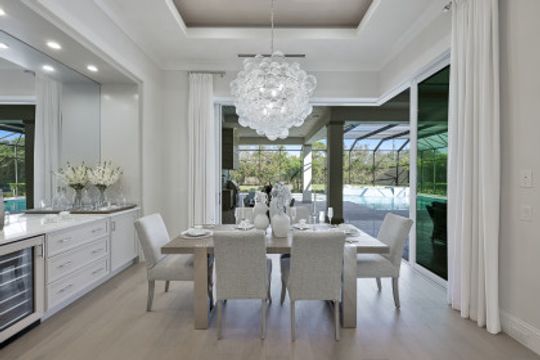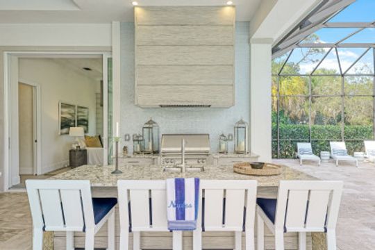Here is your chance to own the former model home for Stock Custom Homes in Naples’ most sought-after community, Pine Ridge Estates. Situated on a 1.28 oversized lot with CITY WATER and a double gated entrance with mature hedges offering serene privacy. The Gardenia III, best known for its open living concept, features 4 ensuite bedrooms plus den, 4.5 baths, an oversized bonus room, and a 3-car garage. Offered FURNISHED by Soco Interiors. Immediately upon entering, you are greeted with a light and bright design with stunning French oak flooring throughout the main living areas. A true focal point, the kitchen is fitted with an oversized island, quartz counters and backsplashes, stainless steel appliances with gas cooktop, and walk-in pantry. The master suite offers dual walk-in custom closets, seating area, and a stunning bathroom with free-standing tub. Notable upgrades include coffered wood ceilings, linear A/C vents, in-ceiling speakers, designer fixtures. The expansive resort-style outdoor area boasts a full outdoor kitchen with waterfall island, salt-water pool and spa, sun shelf with deck jets, two fire bowl features and a beautiful gas fireplace under a covered seating area.