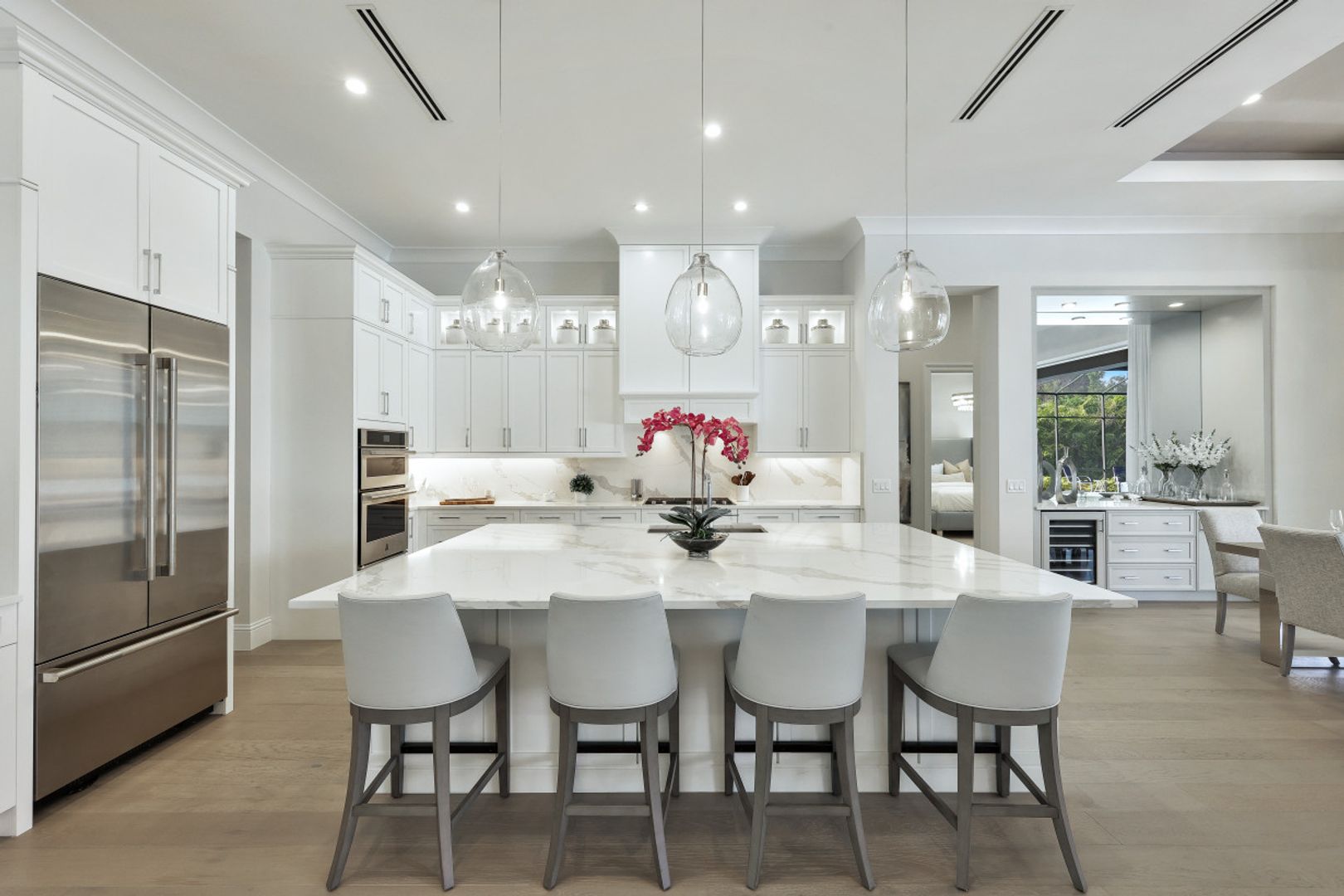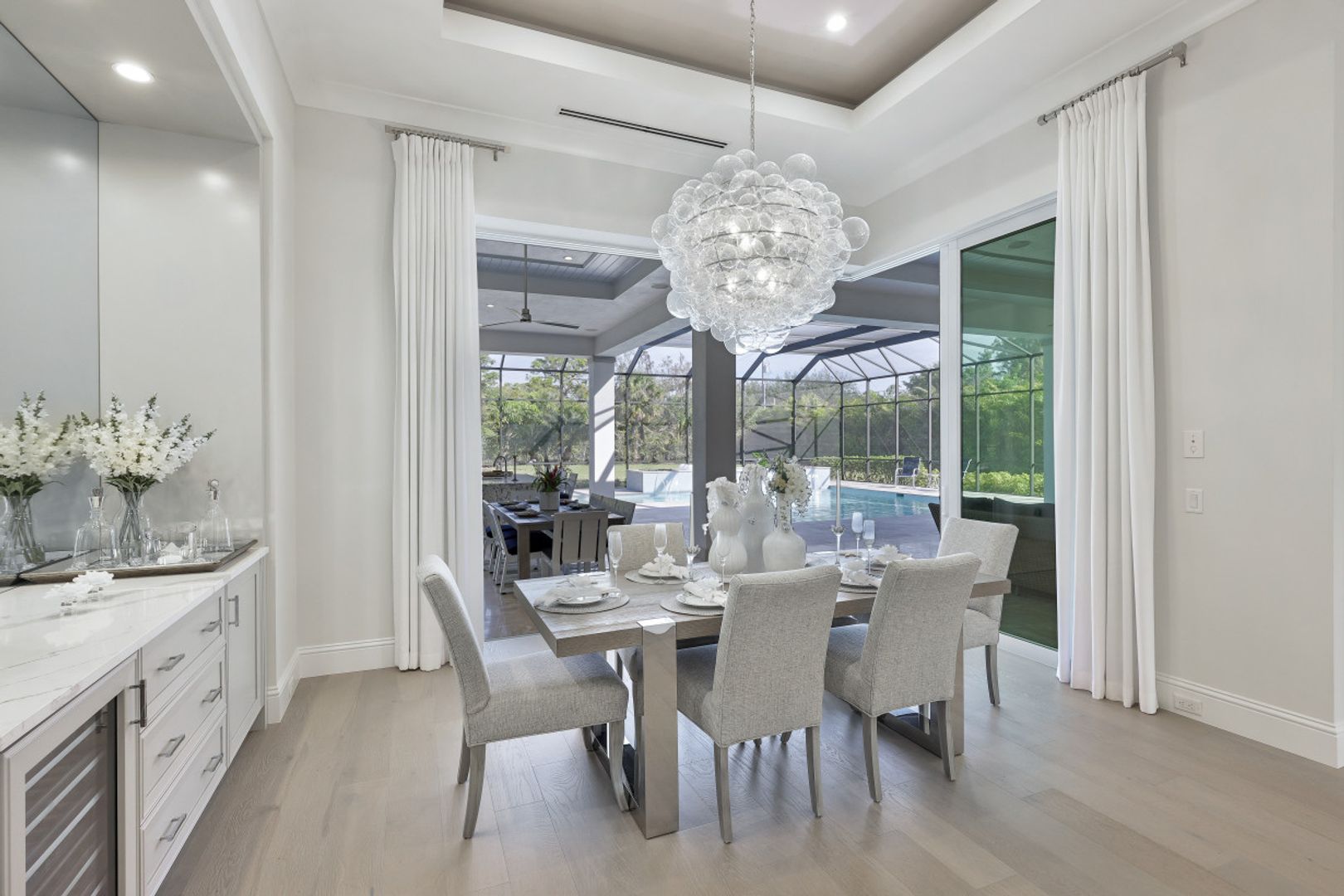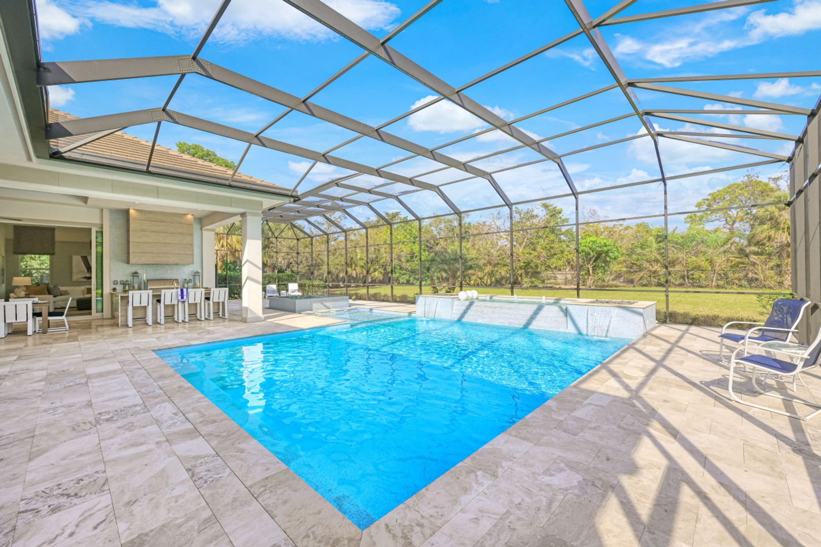 Here is your chance to own the former model home for Stock Custom Homes in Naples’ most sought-after community, Pine Ridge Estates. Situated on a 1.28 oversized lot with CITY WATER and a double gated entrance with mature hedges offering serene privacy. The Gardenia III, best known for its open living concept, features 4 ensuite bedrooms plus den, 4.5 baths, an oversized bonus room, and a 3-car garage. Offered FURNISHED by Soco Interiors. Immediately upon entering, you are greeted with a light and bright design with stunning French oak flooring throughout the main living areas. A true focal point, the kitchen is fitted with an oversized island, quartz counters and backsplashes, stainless steel appliances with gas cooktop, and walk-in pantry. The master suite offers dual walk-in custom closets, seating area, and a stunning bathroom with free-standing tub. Notable upgrades include coffered wood ceilings, linear A/C vents, in-ceiling speakers, designer fixtures. The expansive resort-style outdoor area boasts a full outdoor kitchen with waterfall island, salt-water pool and spa, sun shelf with deck jets, two fire bowl features and a beautiful gas fireplace under a covered seating area.