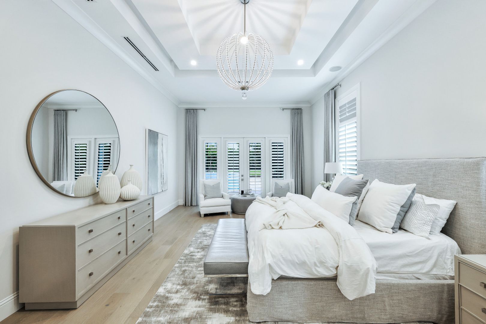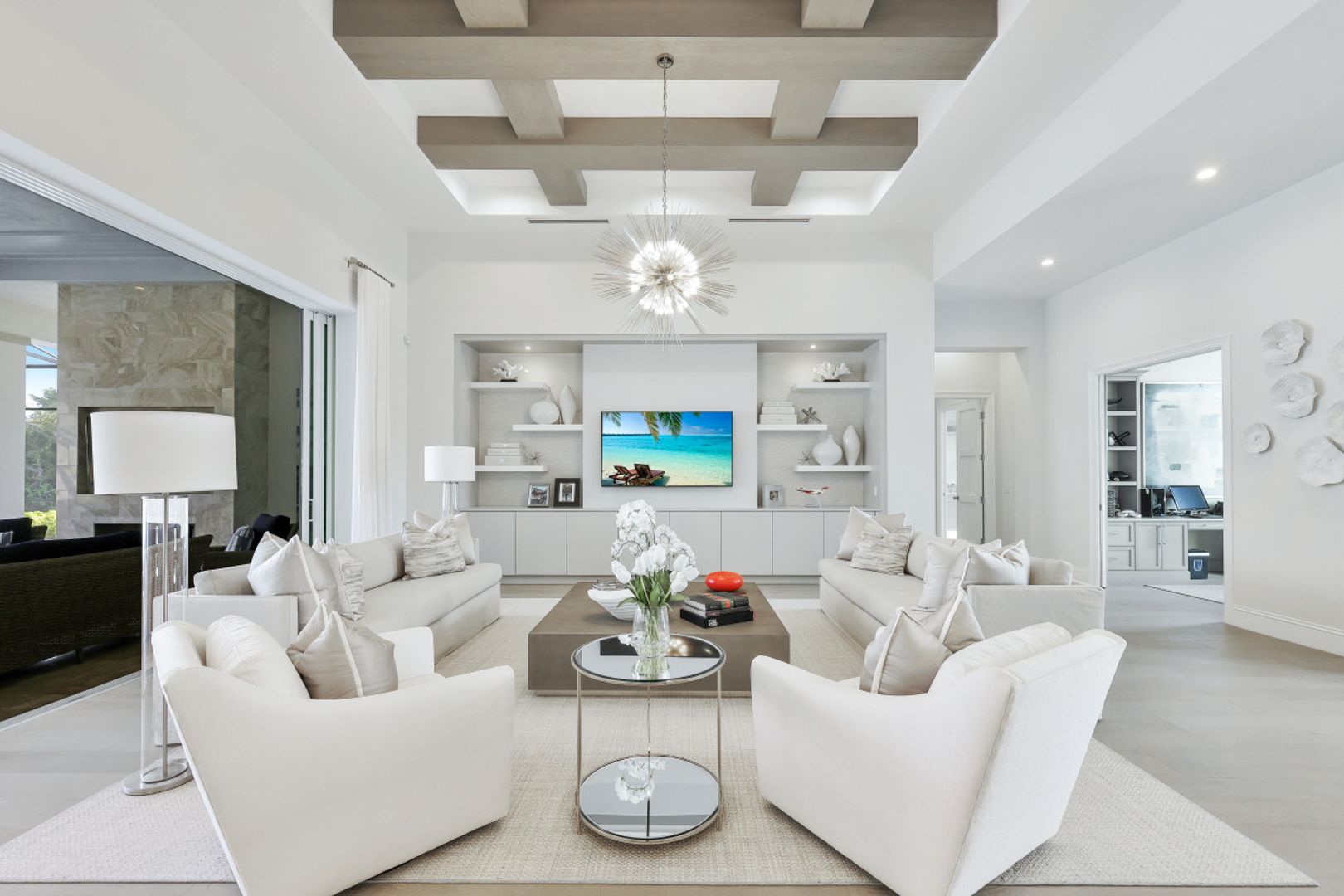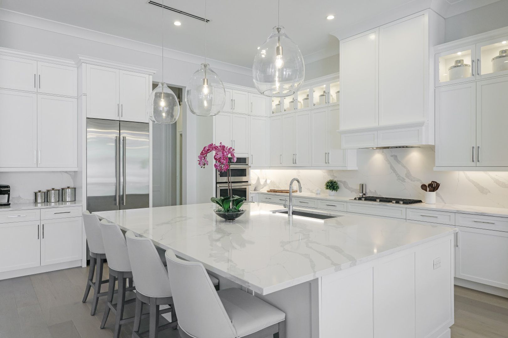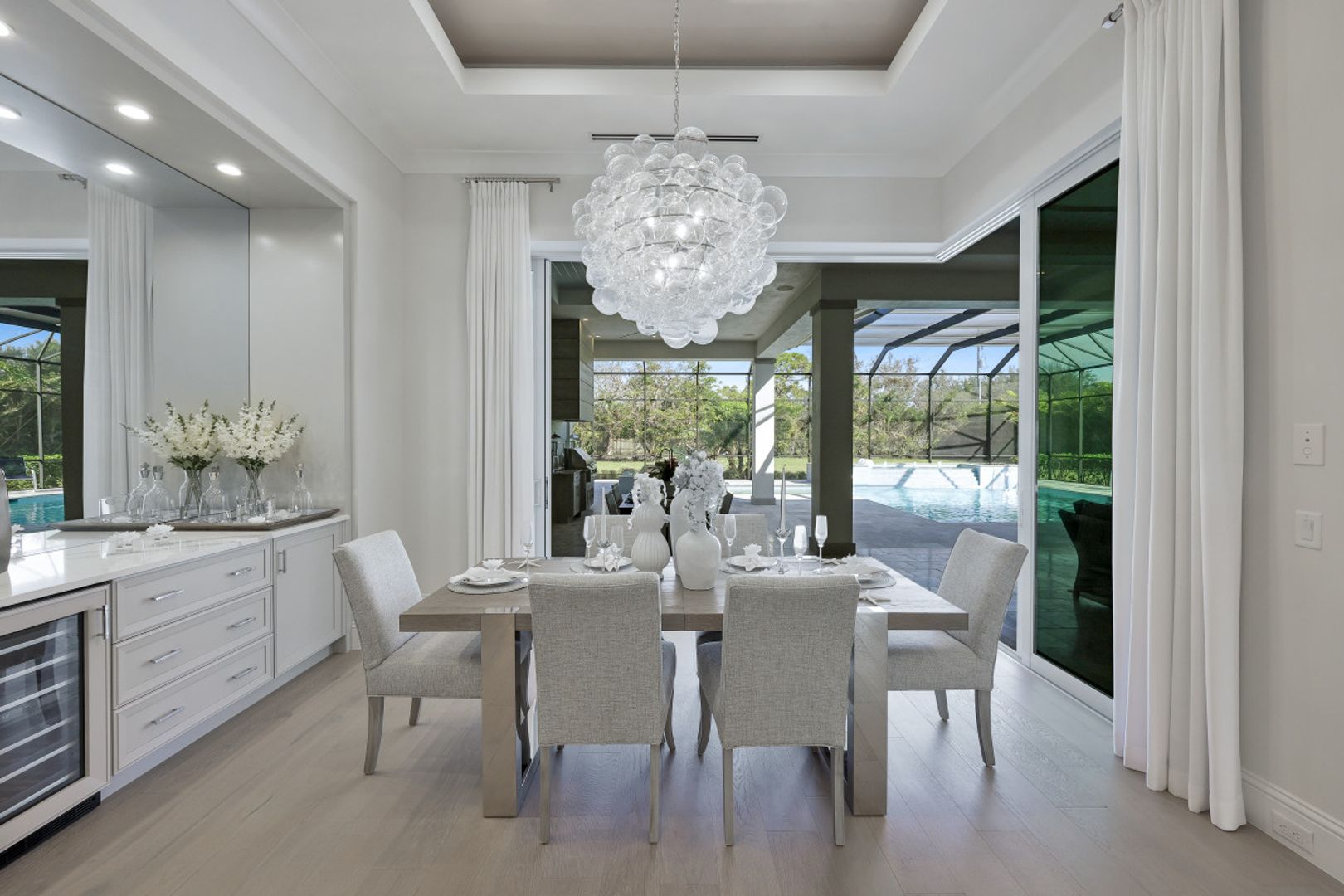 Here is your chance to own the former model home for Stock Custom Homes in Naples’ most sought-after community, Pine Ridge Estates. Situated on a 1.28 oversized lot with CITY WATER and a double gated entrance with mature hedges offering serene privacy. The Gardenia III, best known for its open living concept, features 4 ensuite bedrooms plus den, 4.5 baths, an oversized bonus room, and a 3-car garage. Offered FURNISHED by Soco Interiors. Immediately upon entering, you are greeted with a light and bright design with stunning French oak flooring throughout the main living areas. A true focal point, the kitchen is fitted with an oversized island, quartz counters and backsplashes, stainless steel appliances with gas cooktop, and walk-in pantry. The master suite offers dual walk-in custom closets, seating area, and a stunning bathroom with free-standing tub. Notable upgrades include coffered wood ceilings, linear A/C vents, in-ceiling speakers, designer fixtures. The expansive resort-style outdoor area boasts a full outdoor kitchen with waterfall island, salt-water pool and spa, sun shelf with deck jets, two fire bowl features and a beautiful gas fireplace under a covered seating area.