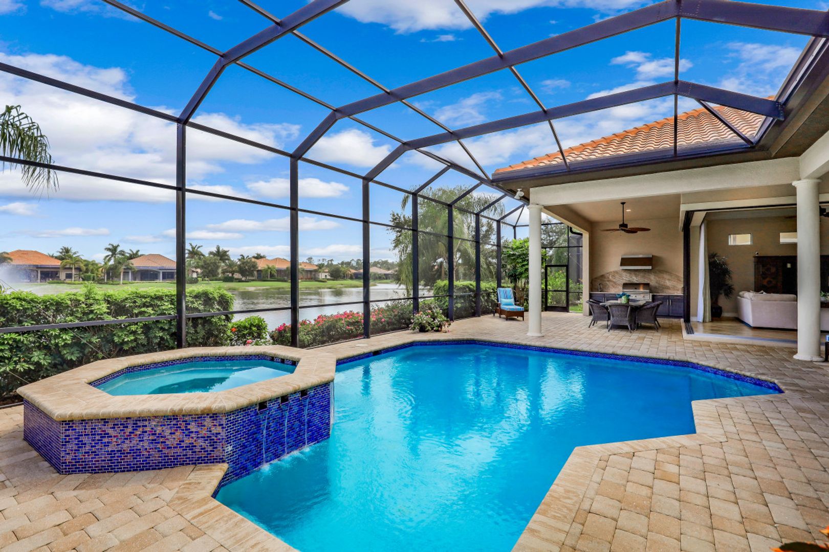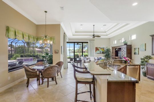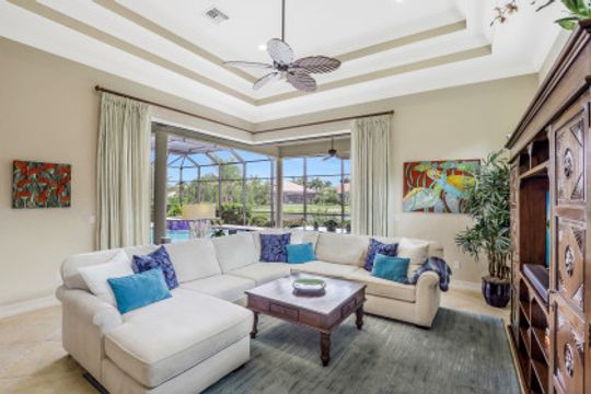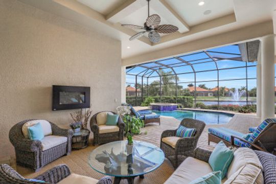 SOLD for $1,600,000. LAKOYA AT LELY RESORT ~ Pristine and meticulously maintained single family home offers SOUTHERN EXPOSURE with WIDE LAKE VIEWS! This desirable HARBOURTOWN II floor plan by Stock Development is 2,815 sq ft under air and includes 3 BR/3 BA plus Study, a 3 CAR GARAGE and over 750 sq ft of outdoor lanai living. His and Her Master Suite Walk-In Closets, volume and tray ceilings, formal dining room, water leak alert system, and more. Indoor/outdoor living connect seamlessly with zero corner sliding glass doors that open to your outdoor dining area, kitchen, custom pool & spa and gas fireplace ~ perfect for entertaining. Freshly painted inside and out, this home includes many upgrades and was professionally designed by its original seasonal owners. Impact doors and windows, and natural gas cooking/pool/spa/fireplace top off this immaculate move-in ready home. Just 10 minutes to downtown Naples for fine dining, shopping and beaches.