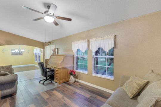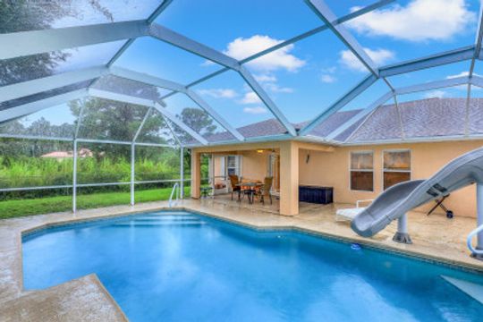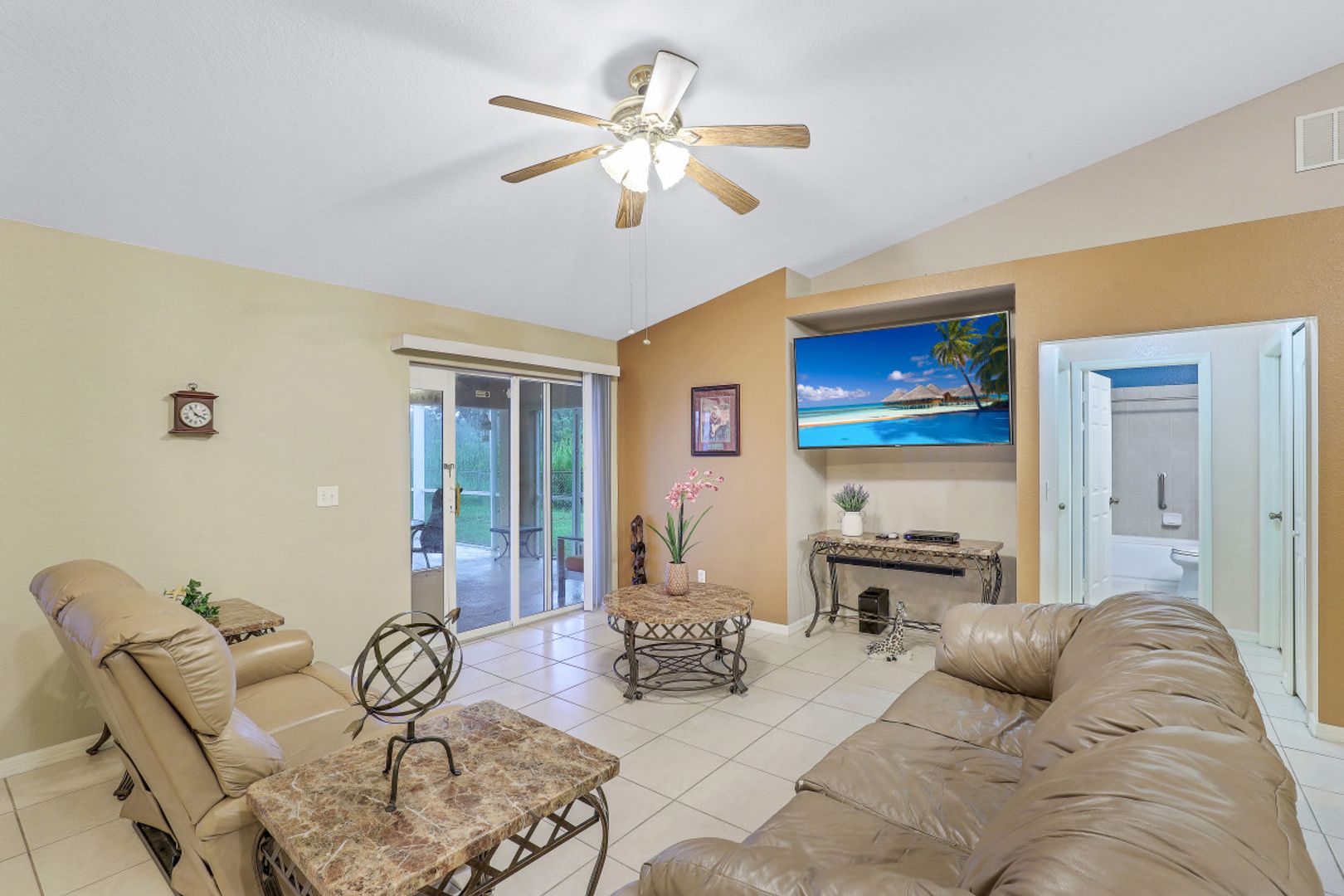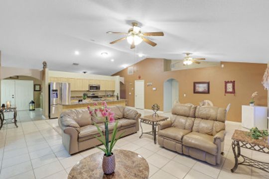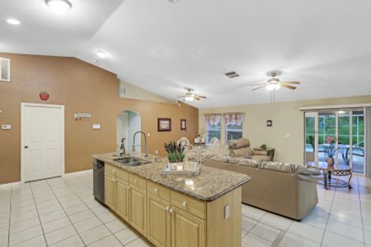 THIS BEAUTIFUL HOME IS THE PERFECT HOME FOR ENTERTAINING FAMILY AND FRIENDS! Spacious Great Room concept combining Living, Dining with open Kitchen. This home welcomes you with double entry doors as you step into the spaciousness of the home's great room, featuring a high cathedral ceiling, which flows to an screened lanai and pool area - perfect for entertaining. Pool area includes a child fence around the pool.The kitchen, featuring stainless-steel appliances, has easy access to the breakfast, family room and formal dining area. The master bedroom is large and features a walk-in closet and an large bathroom with a separate tub and shower. Community amenities such as shopping, parks and recreation are all located within just a short distance of this beautiful pool home. This home a situated in a quiet residential neighborhood, the home has excellent access to Lehigh Acres, Fort Myers, SWFL International Airport, I-75, and SR82.