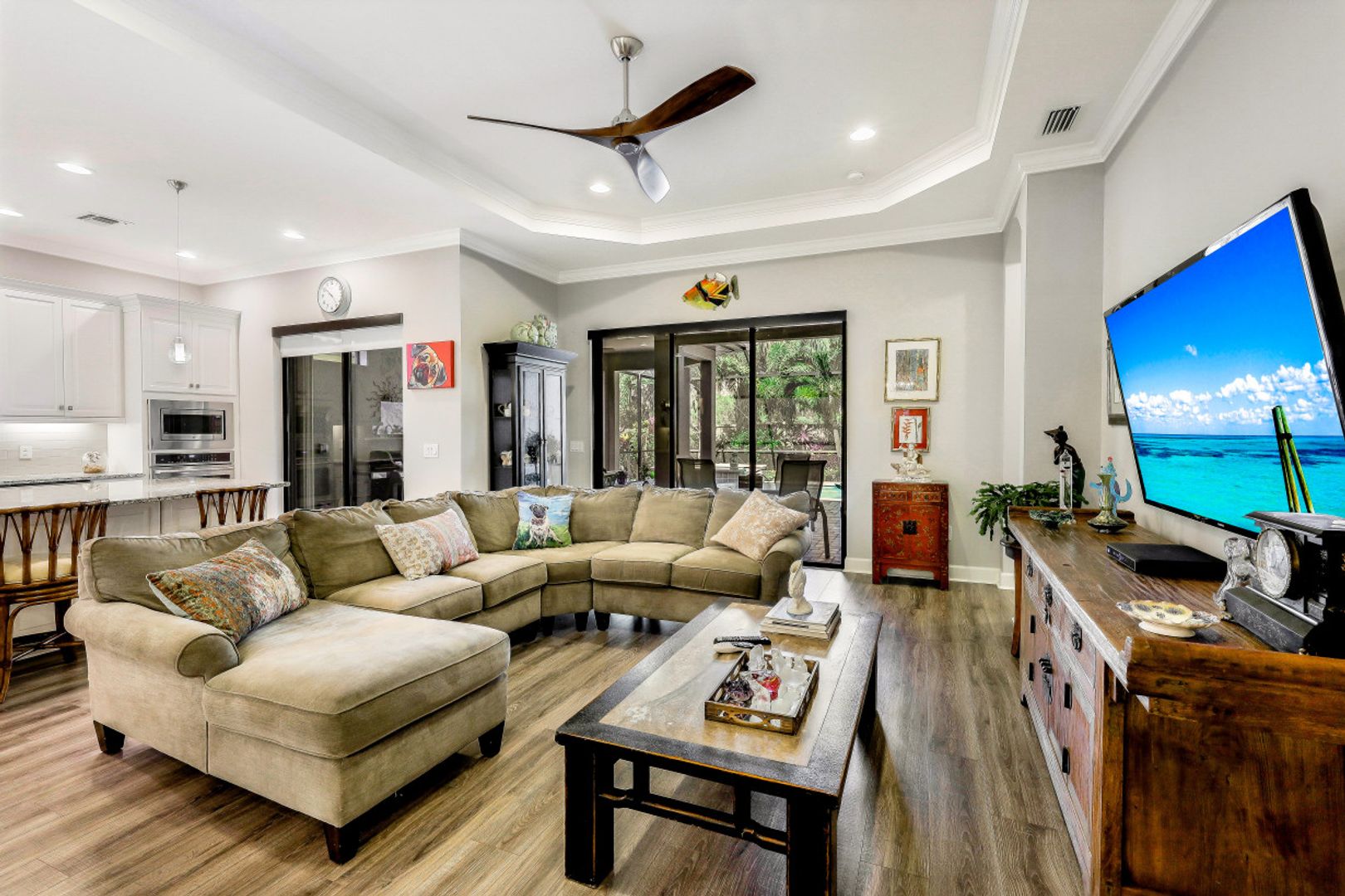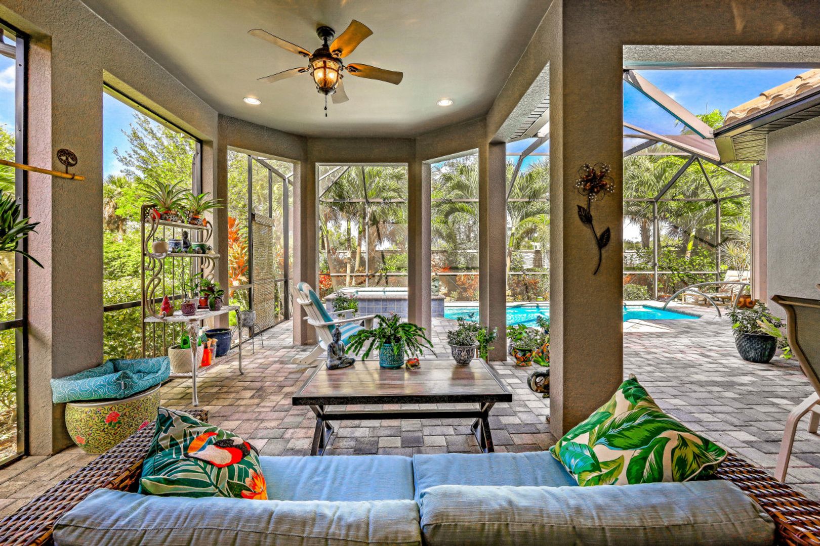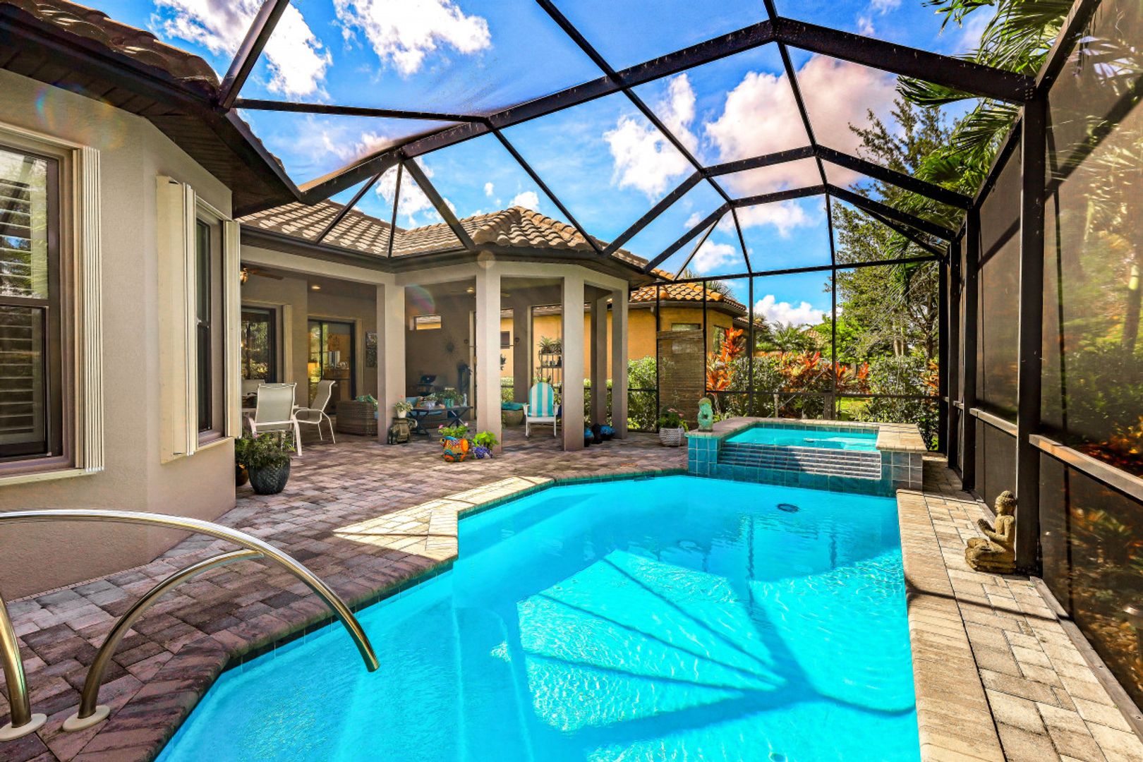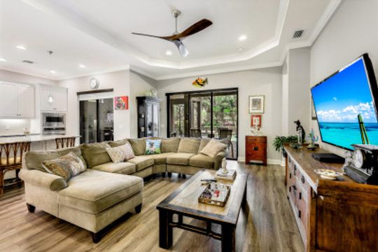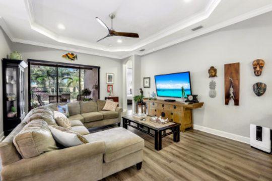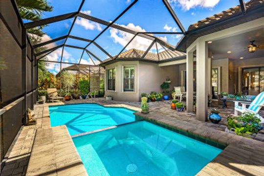 You will never want to leave the vacation-at-home vibe of this nearly new 3 Bedroom plus Den, 3 full bathroom home in the amenity-rich Esplanade at Hacienda Lakes! Lush landscaping envelopes the home in a privacy extended screen lanai oasis with a pool & overflow spa. A paver drive welcomes you to your 4' extended garage. As you step inside this immaculate 2300SF home, you will be in awe of the open concept layout w/western exposure, arched doorways, tray ceilings, high-quality hardwood engineered laminate flooring, accordion hurricane shutters & crown molding. The sleek white kitchen is ideally crafted for the avid chef with w/built-in premium SS appliances, a pantry & large granite island. Two ensuite bedrooms, tankless water heater & whole house gas generator, streamline this beautiful home close to grocers, major shops & restaurants, and only 15min to Marco Island & Naples Pier. Fantastic community with resort pool, resistance pool, spa, gym, yoga studio, clubhouse w/kitchen, pickleball, and tennis. Welcome home!