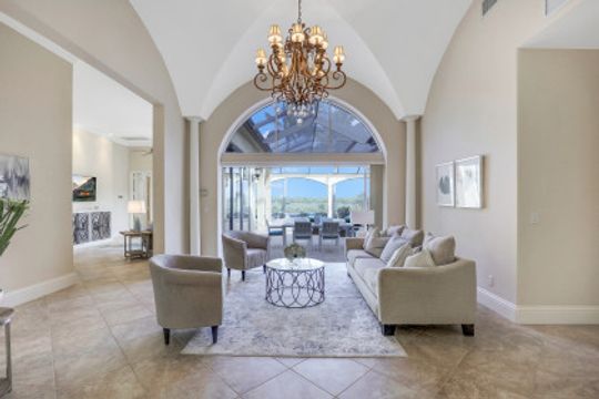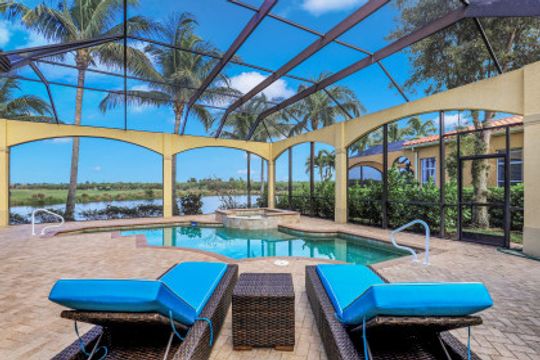 You’ll love this stunning LAKE FRONT home, located in the desirable community of Bellagio at Fiddler’s Creek! This TURNKEY 3 bedroom, 3.5 bath, 2977 square foot home is move-in ready. Features include a new roof, newly sealed brick pavers around the pool, crown molding, plantation shutters, tile throughout the main living area, and a breathtaking foyer w/ custom ceiling detail and French door entry. The bright and airy living space gives you direct outdoor access, and is overlooked by a gorgeous eat in kitchen with granite counters, breakfast bar, custom appliances, upper crown molding on the cabinets and adjacent formal dining room. The master bedroom also provides direct pool access, as well as your own private ensuite complete w/ dual vanities, tiled walk in shower, and separate soaking tub. Both additional guest rooms offer private bathrooms as well! The massive deck is perfect for entertaining guests, or simply taking in the peaceful golf course views from your sparkling pool. Fiddler’s Creek also has plenty of amenities to enjoy, such as a clubhouse, community pool/spa, fitness center, golf course, marina and so much more.