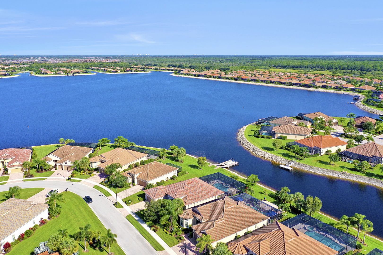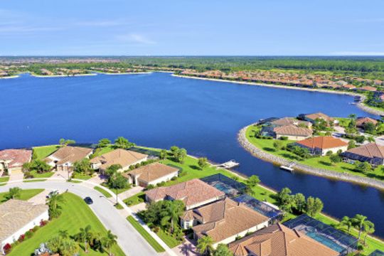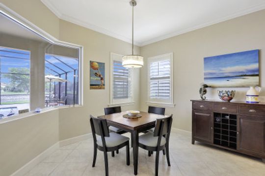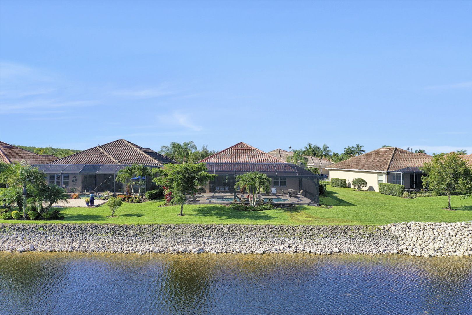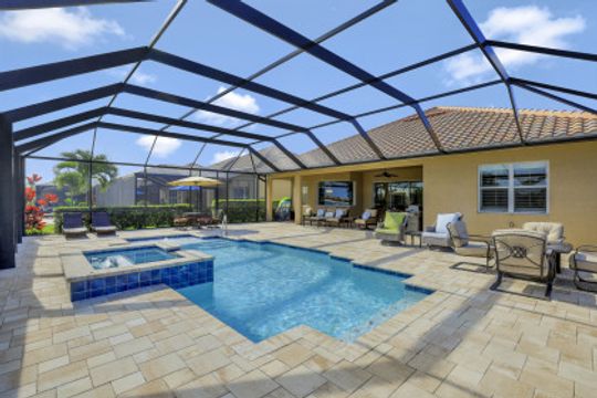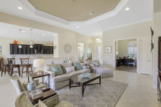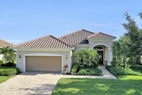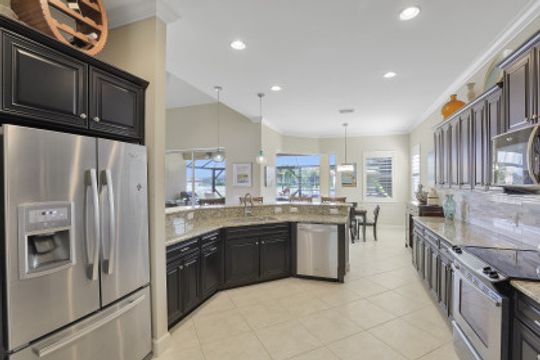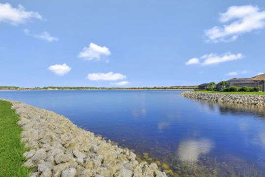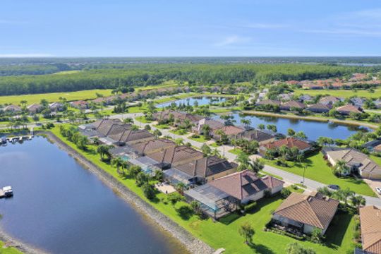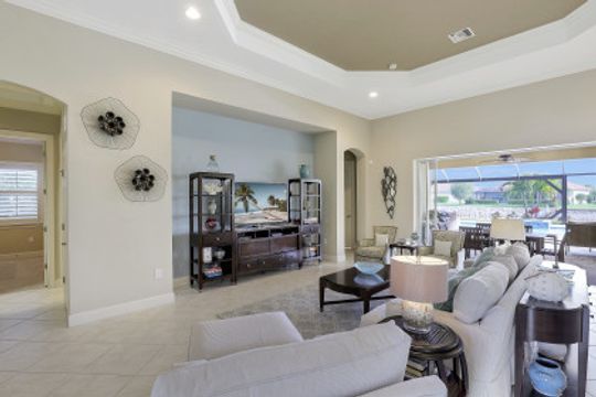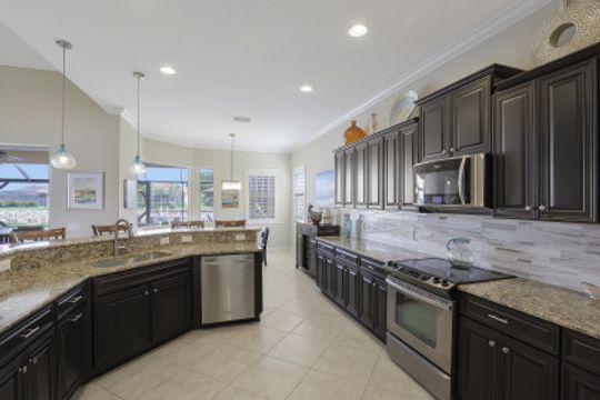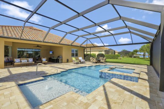 IT'S ALL ABOUT THE MILLION DOLLAR VIEW AND GORGEOUS SUNSETS! This 3 bedroom plus den, 2 bath, 2 car garage open floorplan Barrington I model is in pristine condition. It's many upgrades includes 20" porcelain tile on the diagonal, upgraded kitchen cabinets, upgraded stainless steel appliances, granite countertops, Kinetico water filtration system, plantation shutters and crown molding throughout. The 3rd bedroom is suitable for a home office with wood flooring and double door entry. Also a custom solar heated pool (34x14) with an in-floor cleaning system, extended lanai enclosure and large picture windows, plus much more! A NEW ROOF and Lanai enclosure was installed in 2019. Being on the canal, a dock can be added for access to the freshwater lake. Enjoy a Vacation Lifestyle at The Quarry which is a Gated Lakefront community offering Boating, Golf, Tennis, Pickleball, Bocce Ball, Tiki Bar, Restaurants, Pool-Side Food/Drink Service, Gym, Social Activities and more! The Quarry has 500 acres of lakes that can handle boats and jet skis. The Quarry offers a Private Golf Club which is optional with 18 holes - PGA Level Hurdzan Frye course.