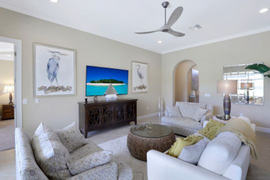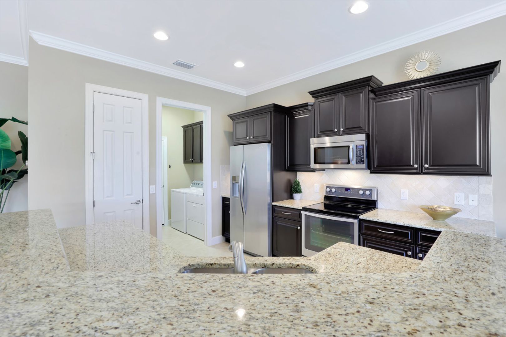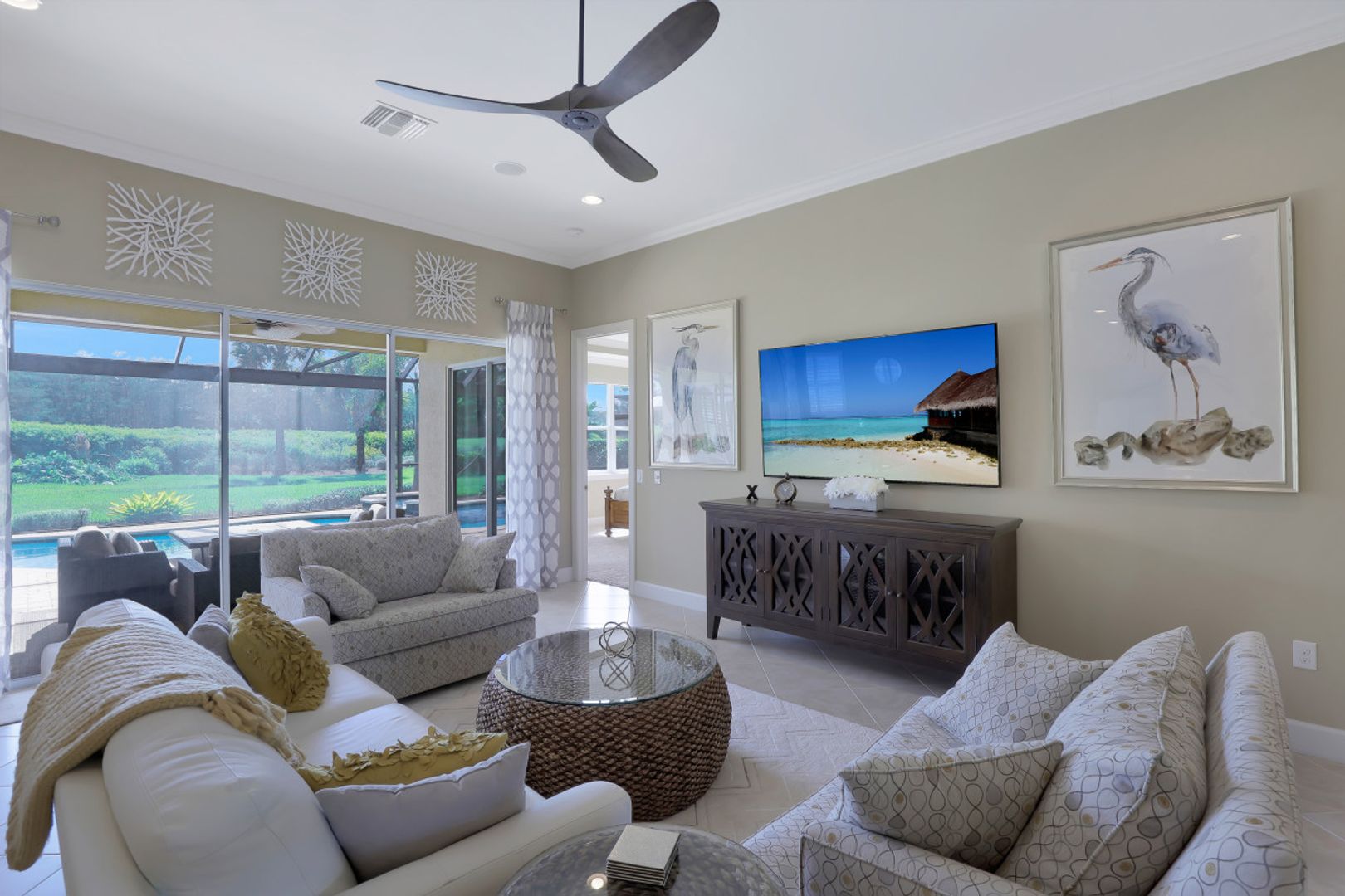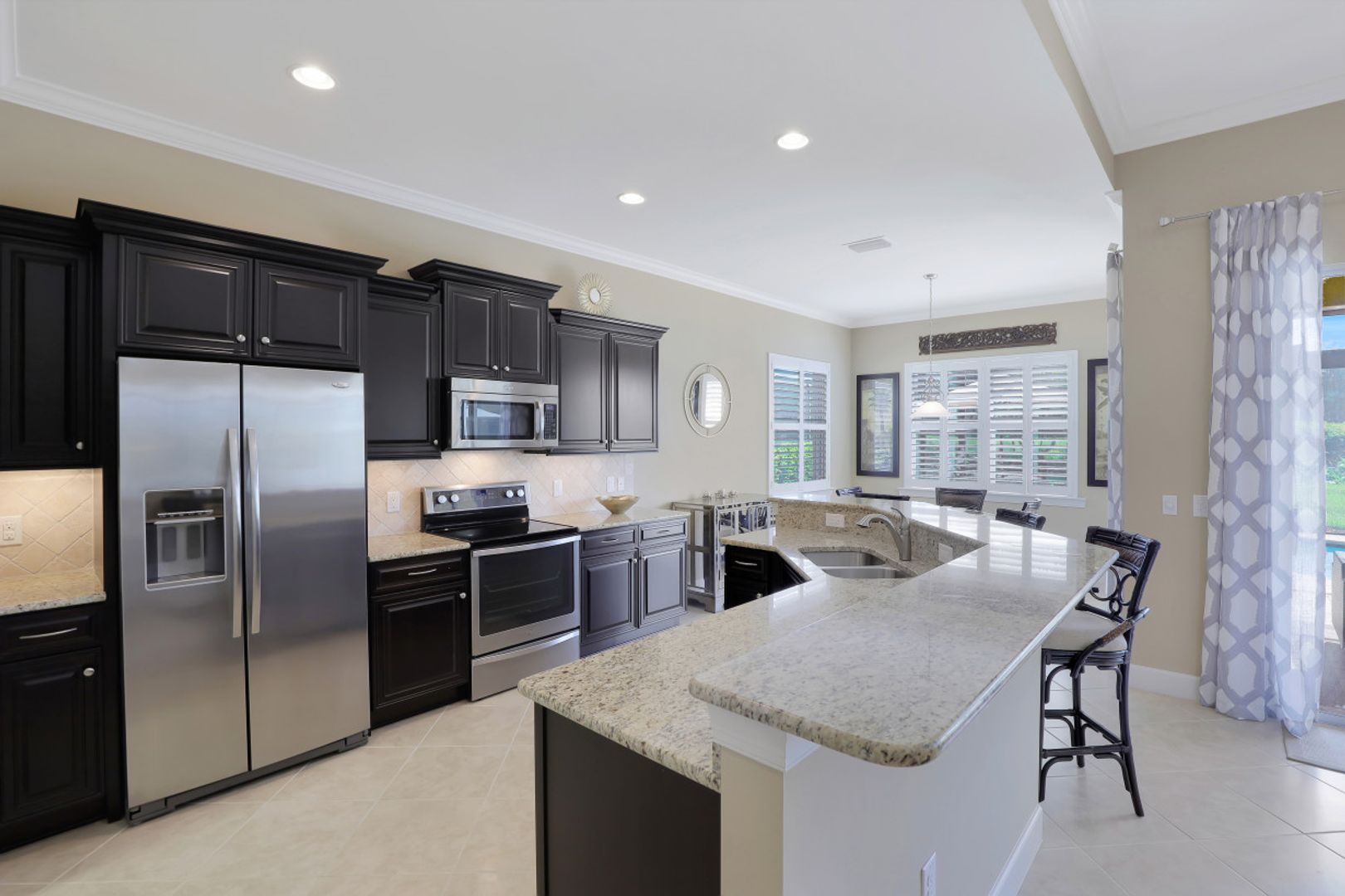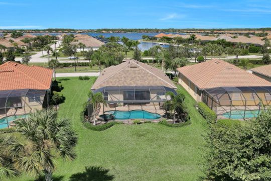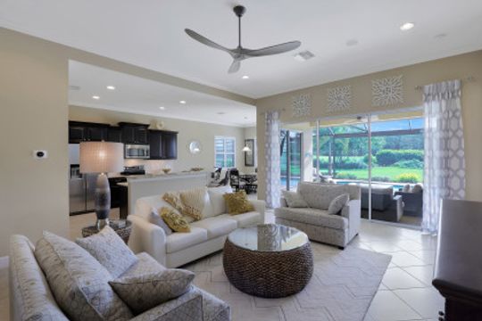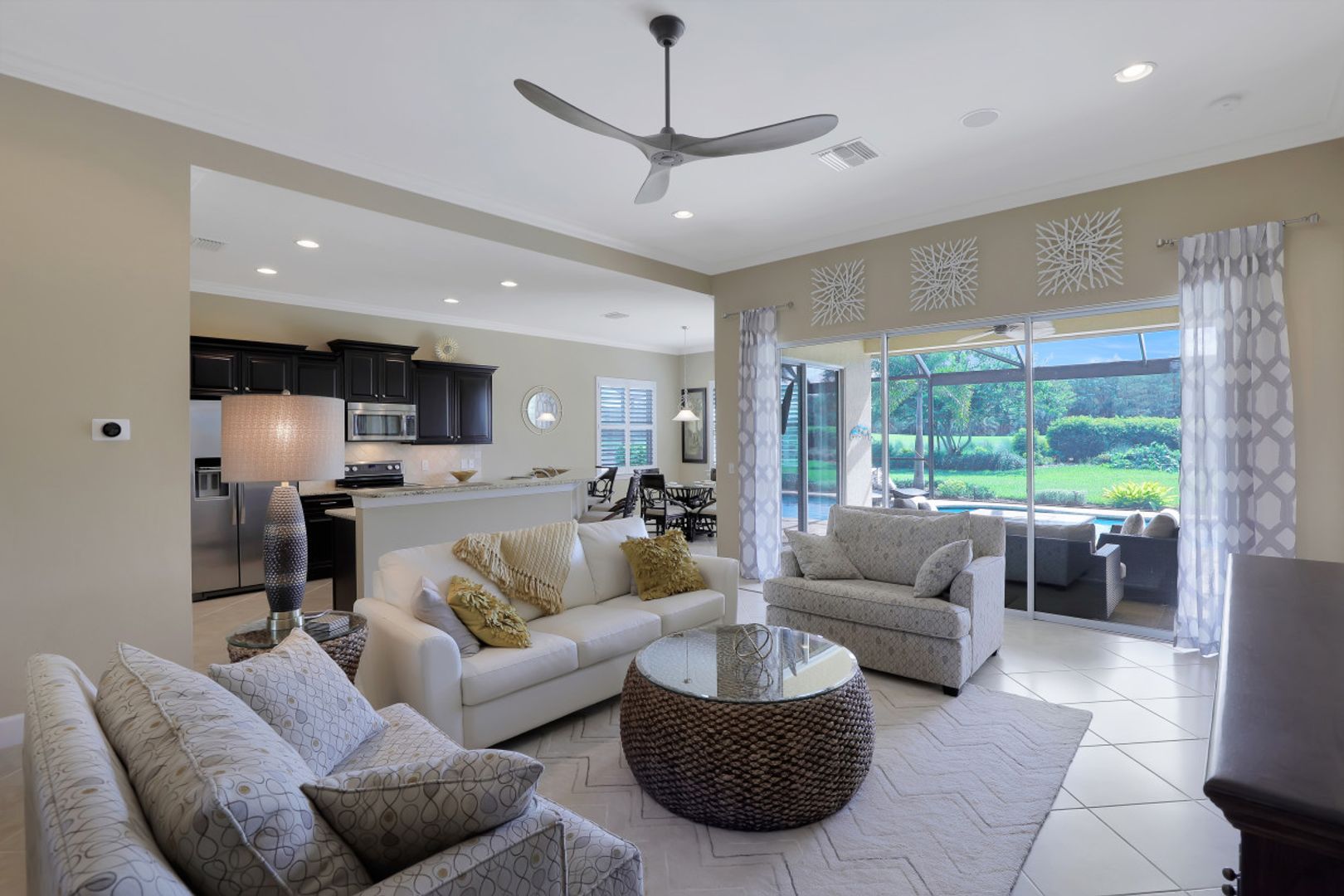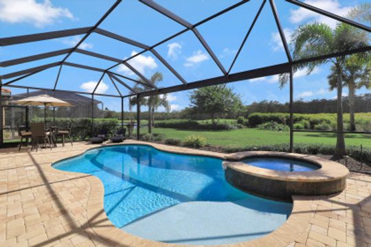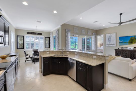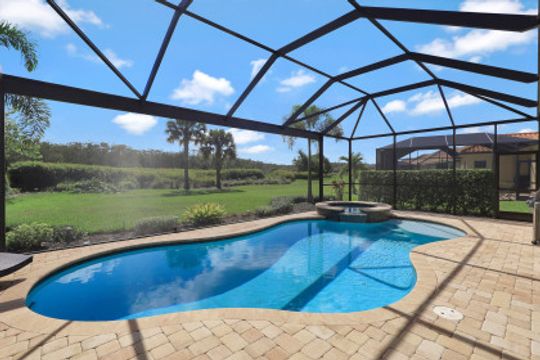 LIVE A VACATION LIFESTYLE IN A COUNTRY CLUB SETTING IN THE QUARRY! This 3 bedroom 2 bath TURNKEY HOME is situated on an expansive lot with a fantastic view of the golf. It has many upgrades including upgraded kitchen cabinets, tile flooring, crown molding, surround sound, plus much more! The lanai area has electric roll down hurricane shutters, heated pool/spa, and encore epoxy garage flooring! The Quarry is a gated lakefront community offering 500 plus acres of lakes for boating, skiing, paddle boarding, jet skiing and fishing. Additional amenities include Tennis, Pickleball, Bocce Ball, a Tiki Bar, Restaurants, Pool-side food/drink Service, Fitness Center and a full-time Activities Director.. The Golf Lodge & Golf Club offers an 18 hole PGA Level Hurdzan Frye Golf Course and its own private clubhouse & restaurant (Membership Optional.)