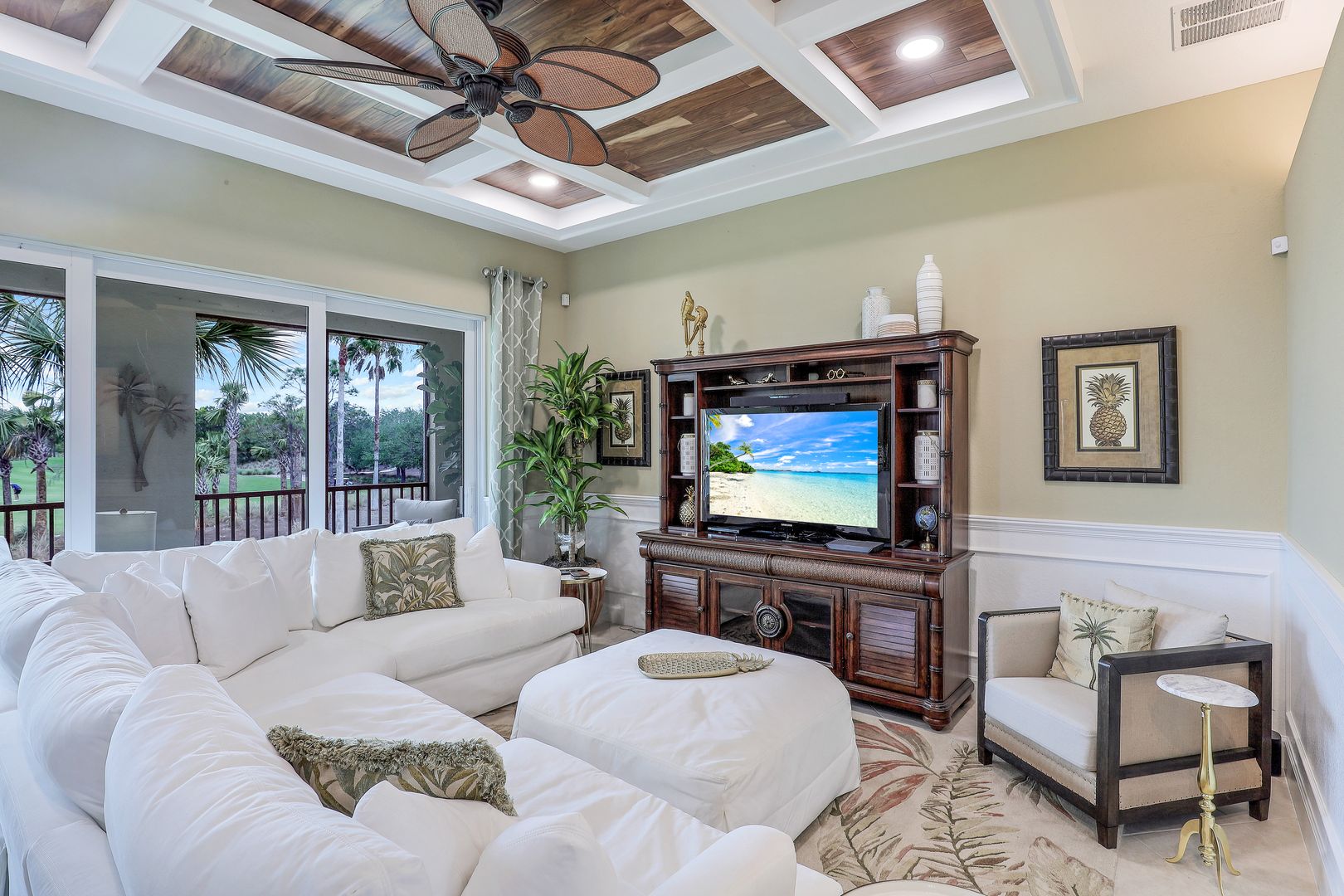 LIVE A VACATION LIFESTYLE IN A COUNTRY CLUB SETTING IN SOUGHT AFTER THE QUARRY! This pristine 2743 sq (under air) PARTIALLY FURNISHED Coach Home features 3 bedrooms, a Den and a Bonus Room and has 3 Full Baths. Many updates and fine appointments including IMPACT WINDOW,DOORS AND SLIDERS (2022) NEWER ROOF (2020), coffered wood ceilings in dining room, living room and entrance way, wainscoting throughout in main living areas , new tile on lanai, updated master shower, cafe appliances in kitchen and updated back splash, new carpeting on stairs(2023), upgraded light fixtures throughout, newly painted (2022), Rockstar custom cabinets and shelving in garage plus more! A "must see" to appreciate the finishing touches! The Quarry is a gated lakefront community offering over 500 acres of lakes for boating, water skiing, paddle boarding, jet skiing, kayaking, and fishing.The Beach Club includes Tennis, Pickleball, Bocce Ball, a Tiki Bar, Restaurant, Pool-Side food/drink service, Fitness Center, and a full-time activities director. The Beach Club is undergoing an $18 million Expansion and Renovation Project which is expected to be completed mid 2023.