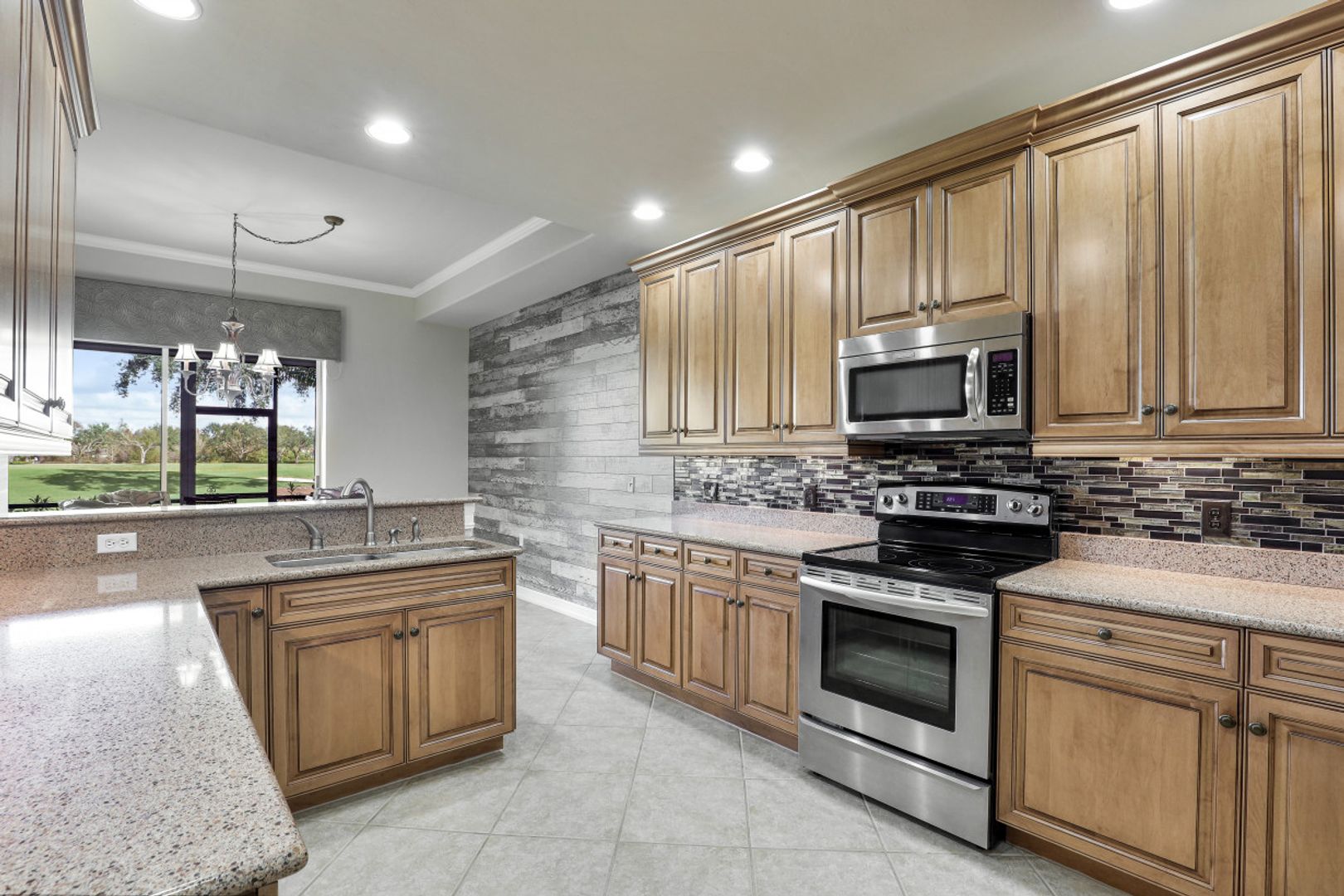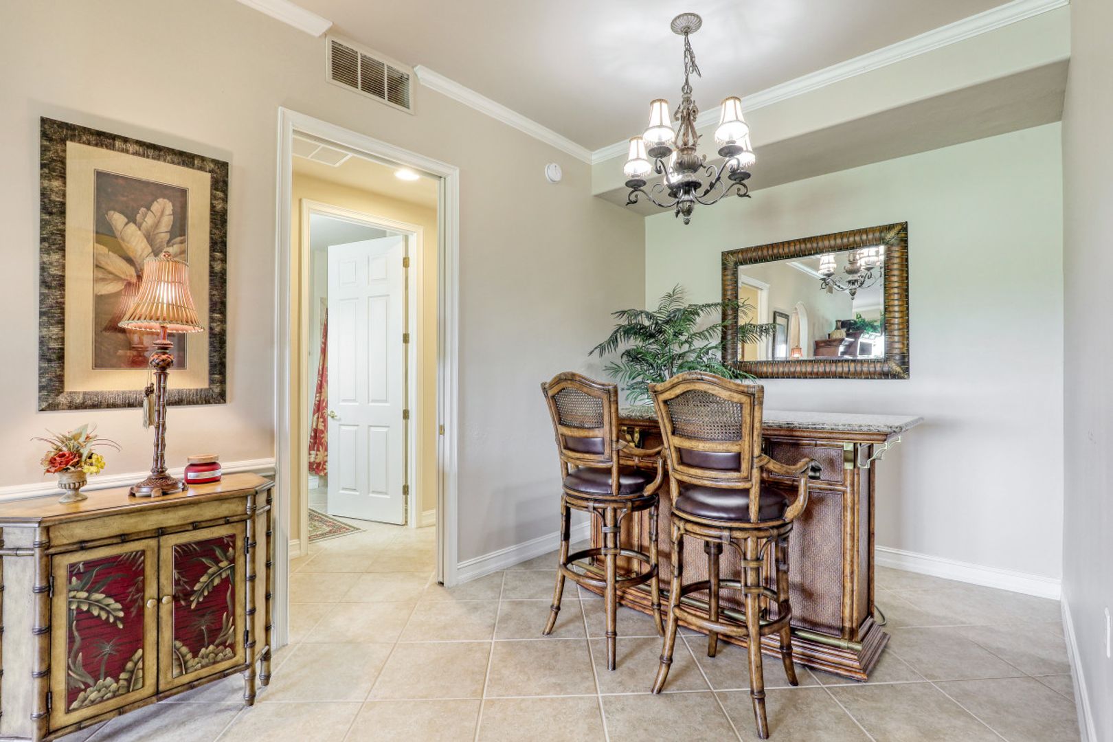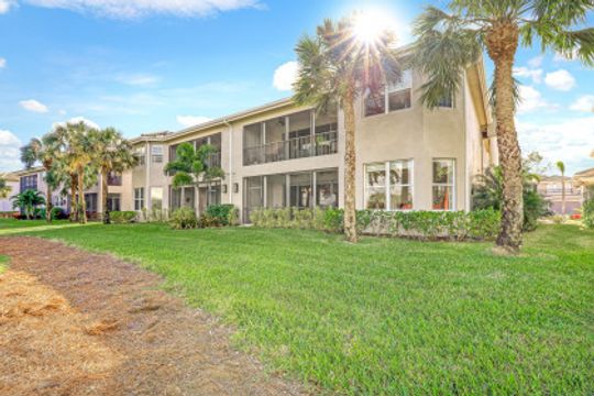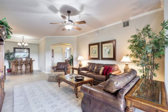 Welcome to this beautiful Sertosa floor plan in the Triana neighborhood of Renaissance! This first floor unit is being offered furnished and is complete with 2 bedrooms + oversized den and 2 bathrooms. This unit showcases serene east facing views overlooking the golf course. Thoughtfully designed with a generous living space, this home features fresh interior paint, high ceilings, custom crown-molding throughout, plantation shutters, upgraded light fixtures and laminate wood flooring in the bedrooms. The renovated kitchen is especially noteworthy and comes complete with granite countertops, glass tile backsplash, stainless steel appliances and 42" solid wood cabinets. Adjacent to the kitchen, the custom accent wood wall is a popular feature overlooking the family dining area. The Renaissance lifestyle includes an Arthur Hills Championship Golf Course, resort style pool and pool pavilion, children’s play area, full service spa & fitness center, 6 red clay tennis courts, 2 pickle ball courts and 2 bocce courts.