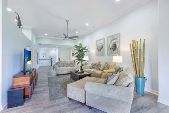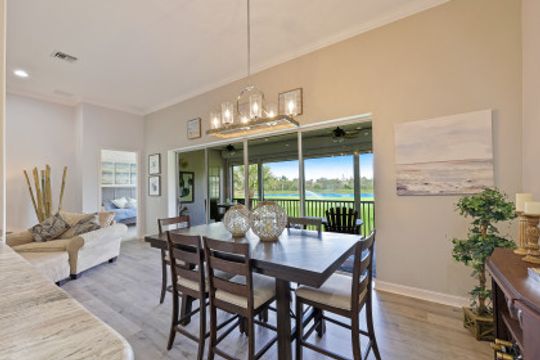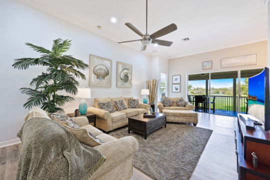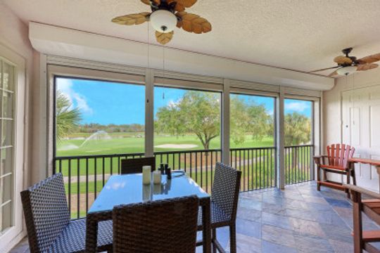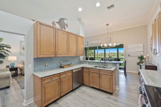 Welcome home to this immaculate, turn-key, 2nd floor Triana Carriage Home! Set among manicured grounds within the private Luxury Golf Community of Renaissance, this beautiful home was redesigned with a simple, modern vision — cool neutral tones, contemporary coastal finishes and an open concept. You will find an interior that flows effortlessly from the incredible open living space to the generously sized screened in lanai. The outdoor space gives you the best of Florida living, with gorgeous views of the sparkling lake and Hole #1 of the Arthur Hills Championship Golf Course. The recently updated kitchen boasts beautiful matte finish granite countertops, glass subway tile backsplash, new stainless steel appliances and large 42” light wood cabinetry! Other notable features include: new luxury vinyl flooring in the main living areas, soaring high ceilings, TWO Master Suites, ample storage and updated lighting fixtures. This home offers the very best of the Southwest Florida lifestyle, and is ready to be enjoyed!