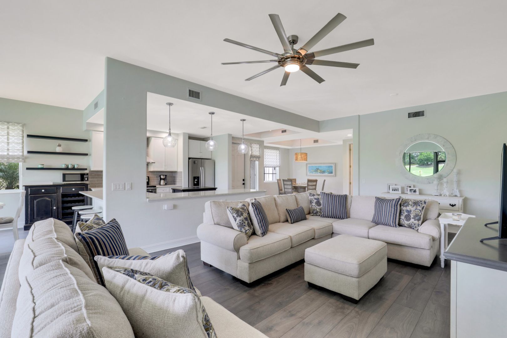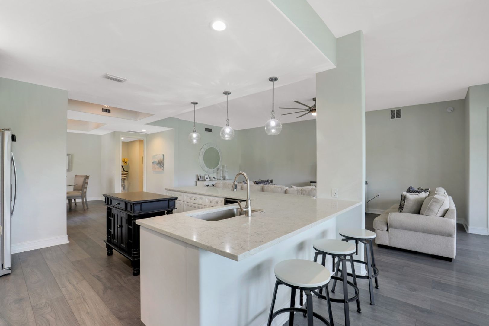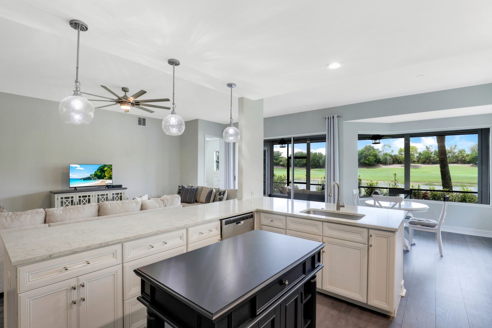 Welcome to this beautiful, re-imagined first floor Carriage Home located in the Triana neighborhood of Renaissance! Offered turnkey, this 3 bedroom + 2 bathroom home has been redesigned to create a modern, open floor plan. Enjoy a beautiful kitchen with quartz countertops and an oversized island offering ample seating for gathering and entertaining. You will love the Swiss Krona luxury vinyl flooring throughout each room, and the large sliding doors and oversized breakfast nook window allowing for abundant light to flow in. A wonderful opportunity to own your very own piece of paradise in the sought after community of Renaissance! Renaissance is a low density, luxury golf community located at the Daniels Corridor in Fort Myers, FL. The Renaissance lifestyle includes an Arthur Hills Championship Golf Course, resort style pool and pool pavilion, children’s play area, full service spa & fitness center, 6 red clay tennis courts, 2 pickle ball courts and 2 bocce courts.