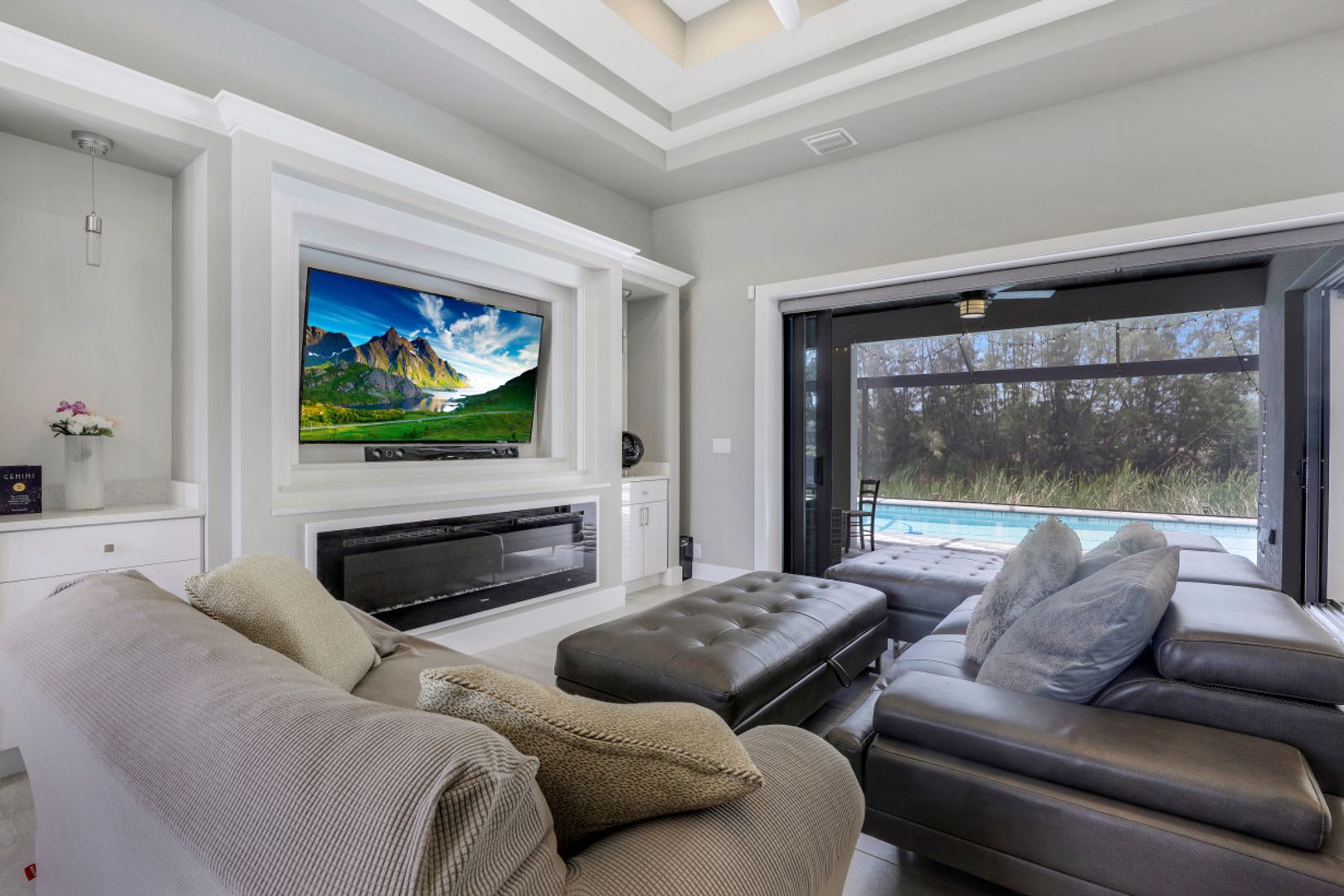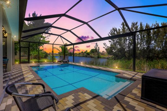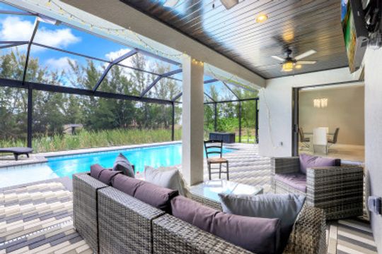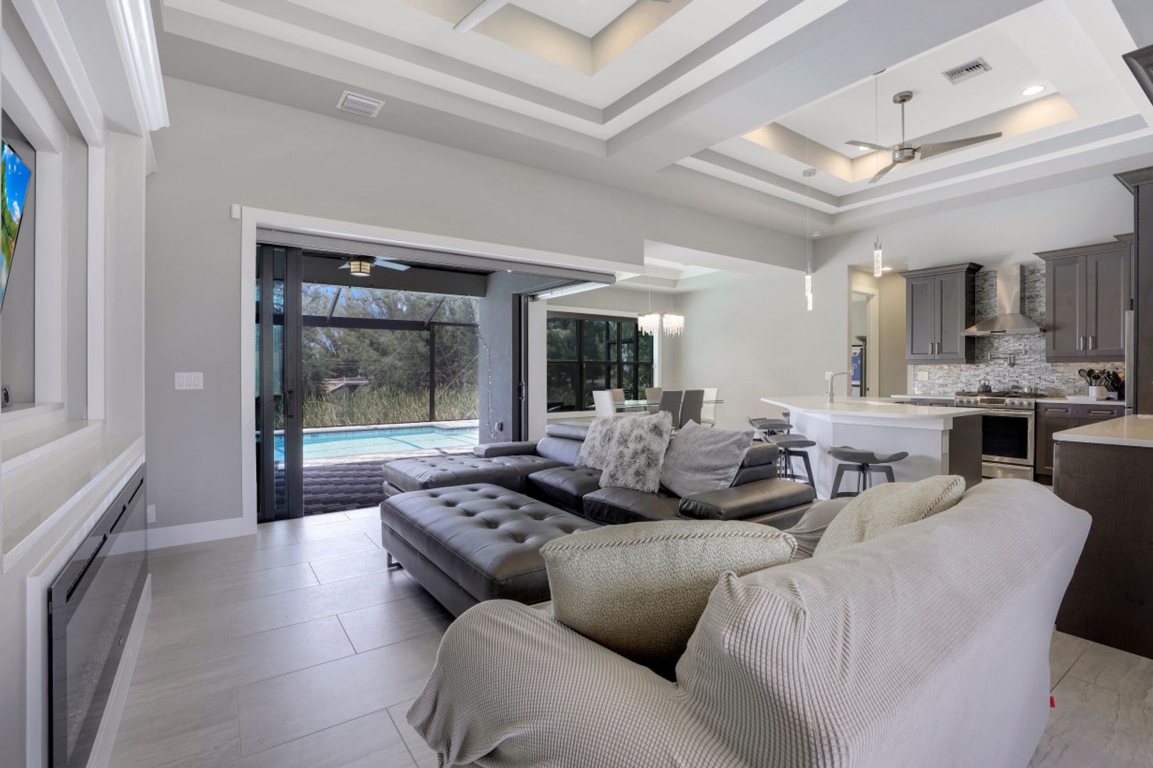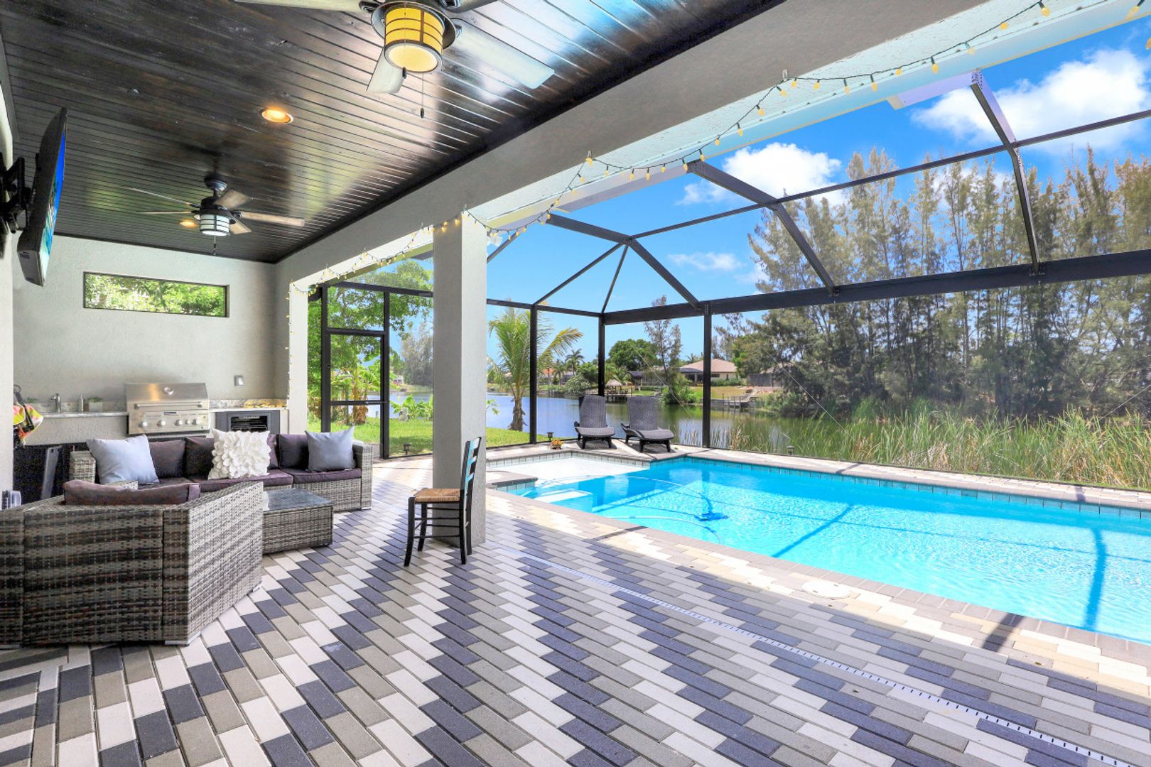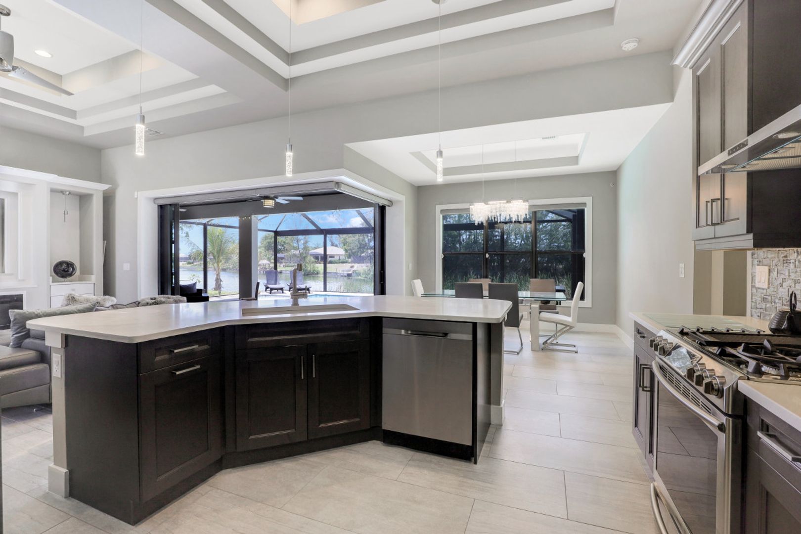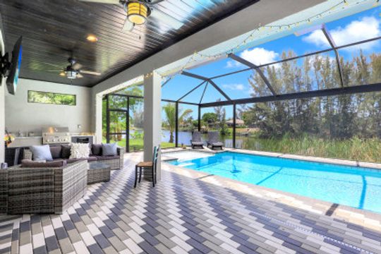 WATERFRONT POOL HOME w/BASIN VIEWS! Upgraded to the max, NOTHING held back on this one! Open floor plan w/over 1800 sqft, 3BR+DEN, 2BA & 2 Car Garage w/split bedrooms & soaring 12 & 14 ft ceilings throughout! Great room has 90 degrees pocket sliders & custom built entertainment center w/lighting & storage! The kitchen features quartz counters, stainless appliances, Samsung propane stove, 42" Cabinets, crown molding, awesome hidden walk in pantry & soft close cabinets. Owners suite has trey ceilings, private sliders to the lanai, dual sinks, walk through shower w/rain shower head, elegant freestanding tub & spacious walk in closets. The outdoor living includes 12 X 28 pool w/sun shelf, summer kitchen w/sink, grill, refrigerator, deck jets & picture window screened lanai. Other upgrades include: 50 gallon propane tank, security cameras & ring doorbell, IMPACT WINDOWS & DOORS, travertine & wood plank tile, epoxy garage, custom window treatments w/remotes & MORE! Enjoy everything that SW FL has to offer - boat, sail, kayak, SUP, jet ski, fish or simply take a dip in your private oasis! White sandy beaches & world class fishing can be at your fingertips-schedule your private tour!