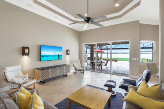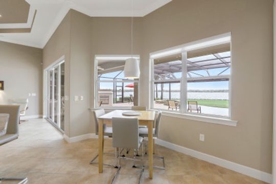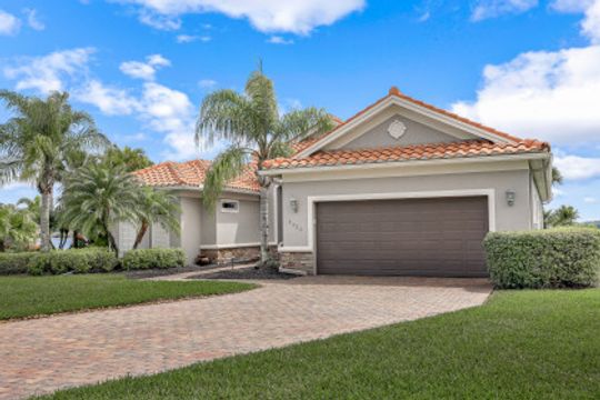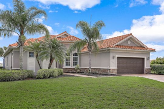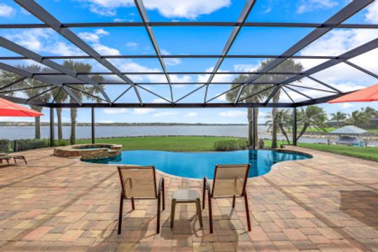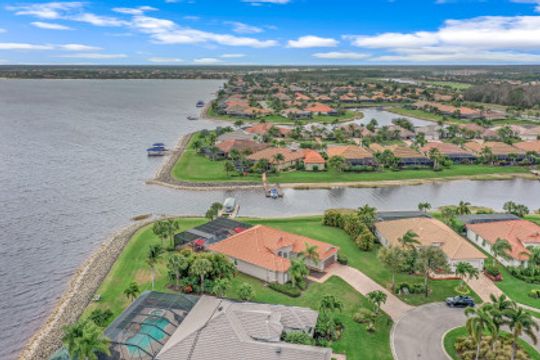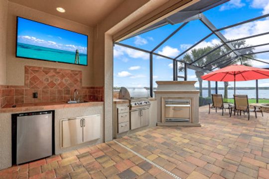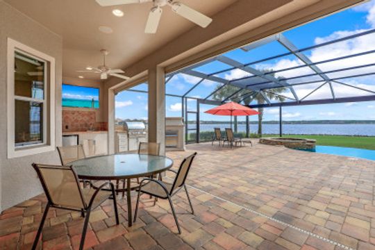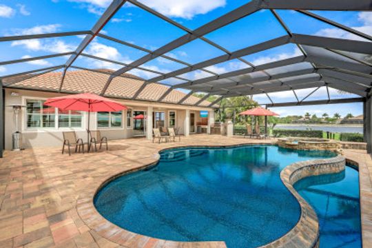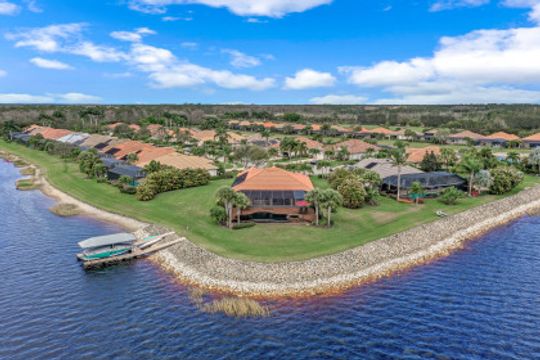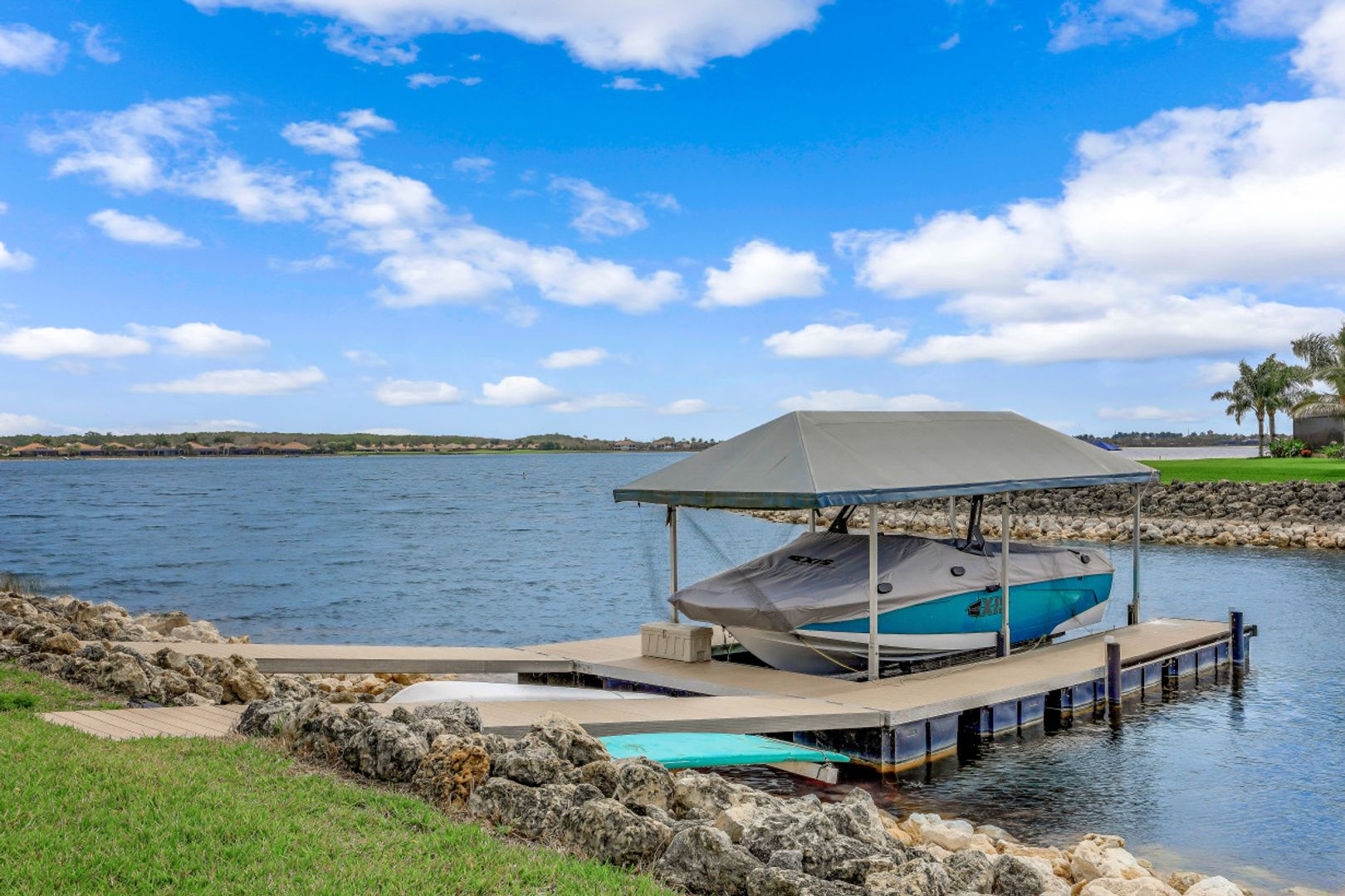 LIVE A VACATION LIFESTYLE IN A COUNTRY CLUB SETTING! THIS RARE PROPERTY IS SITUATED ON AN OVERSIZED LOT ON A QUIET CUL-DE-SAC WITH A GORGEOUS PANORAMIC VIEW OF STONE LAKE! This pristine 3 bedroom plus den (or 4th bedroom) home comes with a Boat Dock and Lift. The moment you walk in the front door you are greeted with a beautiful view of Stone Lake. The spacious lanai features Picture Windows on all sides, an Infinity Pool with 2 pool heaters plus roof mounted solar heating and an Outdoor Kitchen with a Fireplace. Special features include crown molding throughout, diagonal tile floors (no carpet), IMPACT WINDOWS AND DOORS plus more! The Quarry is a gated lakefront community offering over 500 acres of lakes for boating, water skiing, paddle boarding, jet skiing, kayaking, and fishing. The amenity-rich Beach Club includes Tennis, Pickleball, Bocce Ball, a Tiki Bar, Restaurant, Pool-Side food/drink service, Fitness Center, and a full-time activities director. The Beach Club and Lake Lodge are undergoing a $15 million Expansion Project. The Golf Lodge and Golf Club offers an 18 holes PGA Level Hurdzan Frye Golf Course and it's own private clubhouse and restaurant.(Membership Optional)