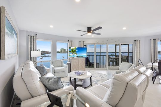 Views for miles from this spectacularly re-imagined and completely renovated 3 bedroom 2 bath condo. Deeded, brand new 30ft BOAT dock with 12,000lb lift. . One of only four 3 bedroom units in the complex. No stone was left unturned in the remodelling of this gorgeous property. This fully furnished unit with new tile floors throughout, Impact glass windows and sliders, new bathrooms, and a new open concept large kitchen are just a few of the numerous, thoughtfully executed upgrades in this phenomenal home.